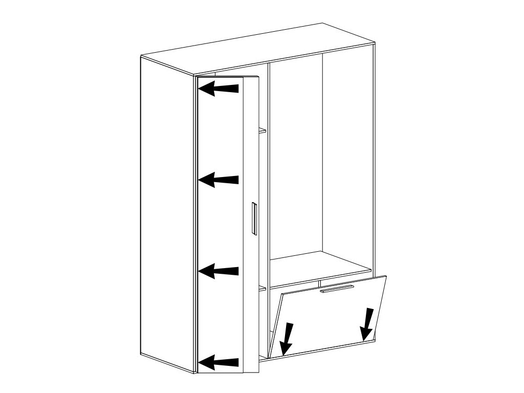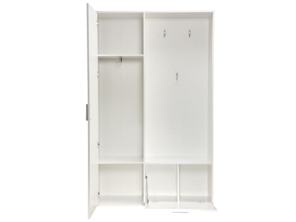 Moderní předsíňová stěna. Je vyrobená z kvalitní laminátové desky 16 mm. Korpus i dvířka jsou v barvě bílá alpská. Sestava se skládá z věšákového panelu, výklopného botníku a šatní skříně se zrcadlem ( uvnitř 2 police a šatní tyč ). Dodáváme v demontovaném stavu.Doplňkové parametry
