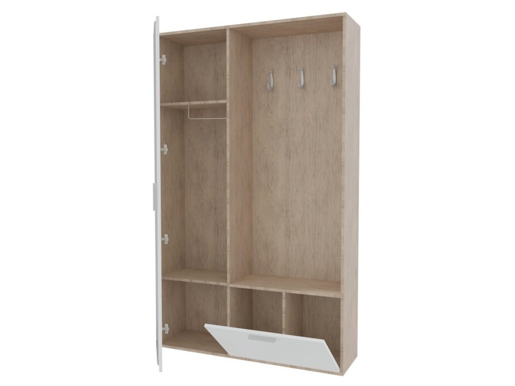 Moderní předsíňová stěna. Je vyrobená z kvalitní laminátové desky 16 mm. Korpus i dvířka jsou v barvě dub sonoma. Sestava se skládá z věšákového panelu, výklopného botníku a šatní skříně se zrcadlem ( uvnitř 2 police a šatní tyč ). Dodáváme v demontovaném stavu.Doplňkové parametry