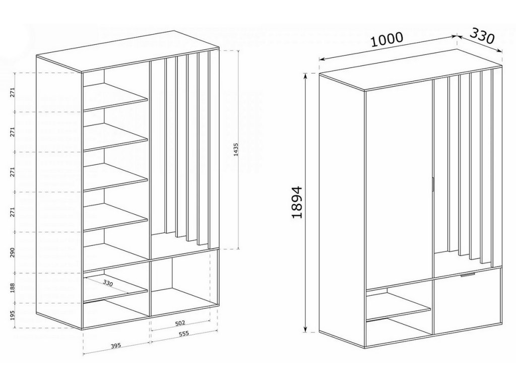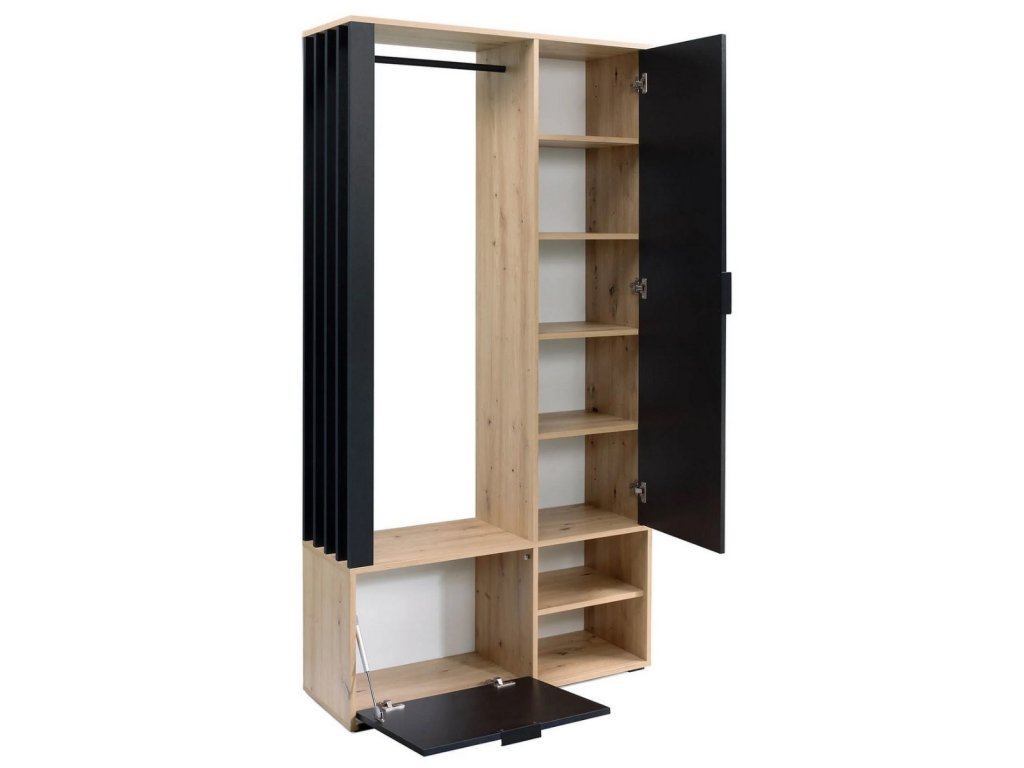 Moderní předsíňová stěna, vyrobená z kvalitní laminátové desky 16 mm v barvě dub artisan. Boční strana předsíně je tvořena z lamel v barvě dub artisan. Sestava se skládá z věšákového panelu, botníku a skříně se zrcadlem. Předsíň je univerzální, dá se složit na obě strany. Dodáváme v demontovaném stavu.Doplňkové parametry
