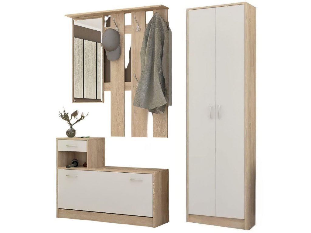 Moderní předsíňová stěna se zrcadlem a skříní. Stěna je vyrobena z kvalitní laminátové desky v barevné kombinaci dub sonoma/bílá mat. Součástí stěny je věšáková stěna se zrcadlem a poličkou a malý výklopný botník s policí a zásuvkou (100x187x27,5 cm) a šatní skříň (55,3x191x27,5 cm). Jednotlivé díli lze zakoupit zvlašť. Dodáváme v demontovaném stavu.Doplňkové parametry