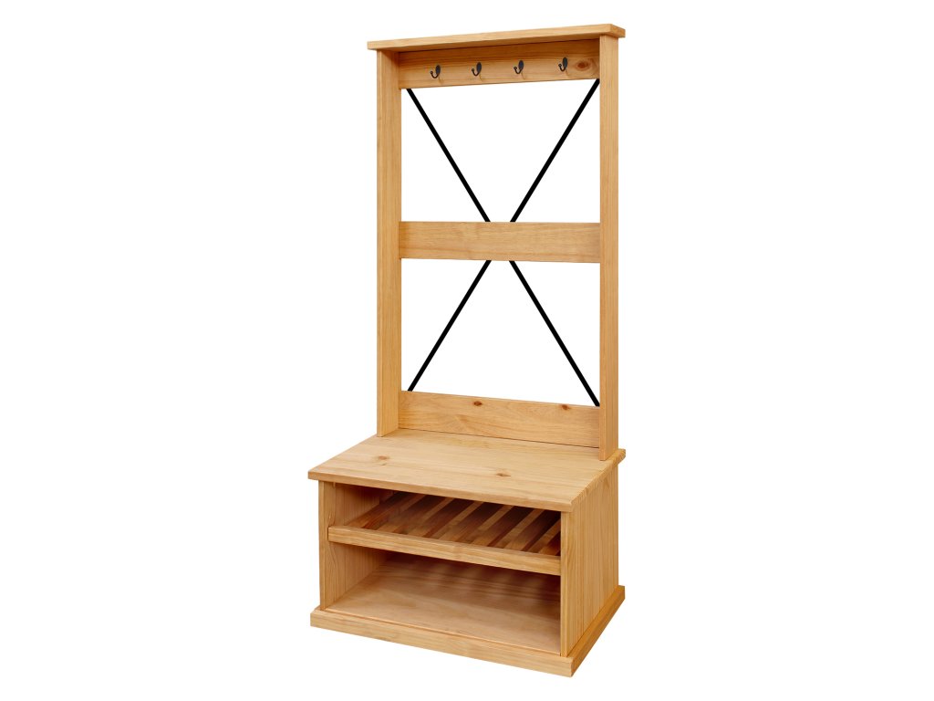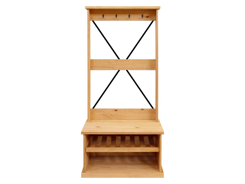 materiál masiv borovice voskovaná v medovém odstínu 4 kovové háčky, 2 otevřené police na boty výška sedu lavice 45 cm součást sestavy Corona 2Doplňkové parametry