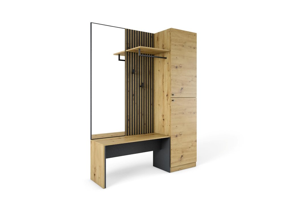 O stylový design Vaší vstupní části se postará moderní předsíňová sestava . Kombinace moderních barev jako dub Artisan v kombinaci s barvou antracit jí dodává jedinečný charakter. Designovým prvkem je zadní panel imitující trendové lamely. Za praktický rozměr sestavy jsou zodpovědné úložné prostory v podobě šatní skříně ve které se nacházejí 3 police. Snadný přístup ke kabátům zabezpečují věšáky, které jsou připevněny k zadnímu panelu panelu a také šatní tyč.