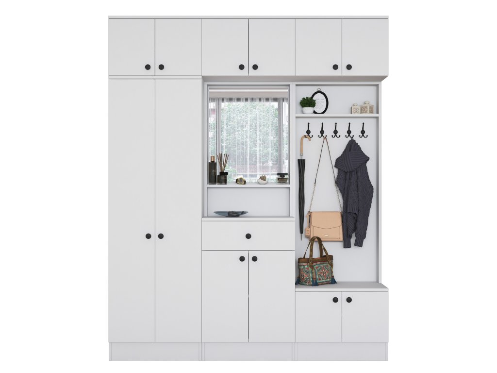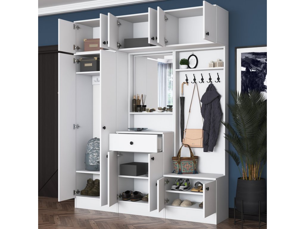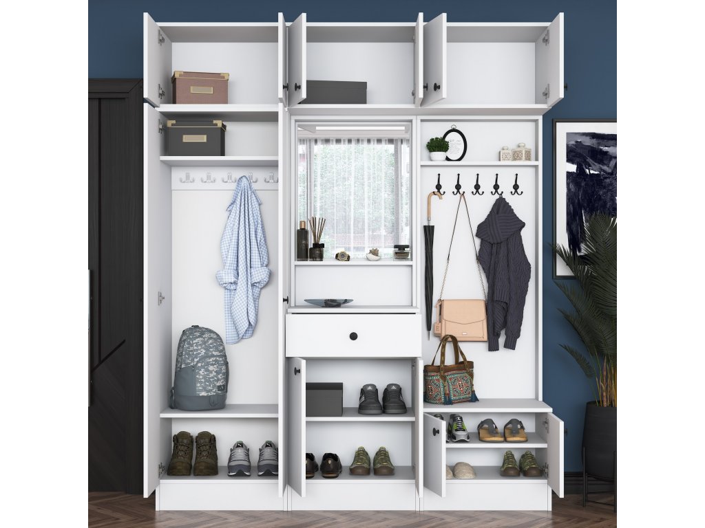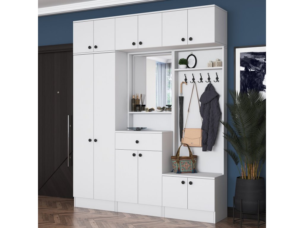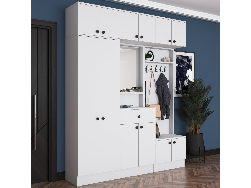 Předsíňová sestava je dokonalou kombinací elegance a funkčnosti. Je navržena v čistě bílém provedení ve skandinávském stylu, který dodává prostoru svěžest a moderní vzhled. Vysoké provedení a chytré uspořádání nabízí dostatek úložného prostoru pro vaši předsíň.