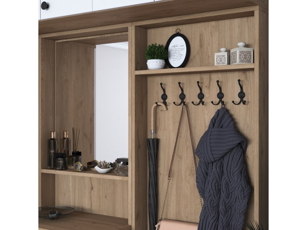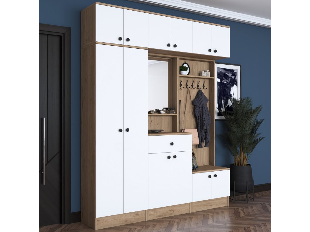 Předsíňová sestava je navržena tak, aby zajišťovala maximální funkčnost a stylový vzhled. Díky své vysoké konstrukci a kombinaci bílé barvy s dekorem ořechu dodává prostoru moderní a útulnou atmosféru. Sestava nabízí dostatek úložného prostoru a chytrých řešení pro organizaci vašich věcí.
