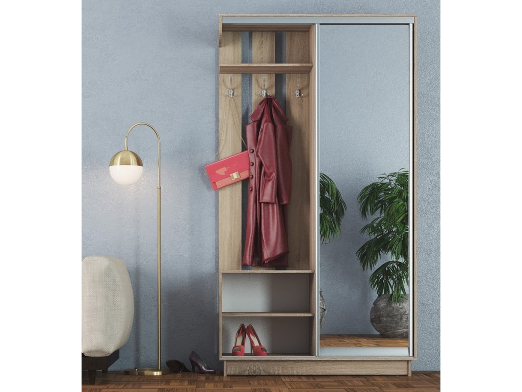 Šatní skříň/předsíň v moderním provedení. Tato šatní skříň Vám nabízí nejen skrytý úložný prostor, ale také otevřenou věšákovou stěnu, což oceníte nejen ve své ložnici, ale také v předsíní, vstupní hale, chodbě či kanceláři. Nezvyklá výška 220 cm nabídne opravdu dostatek prostoru. Korpus i dveře jsou z kvalitní LTD desky v barvě dub sonoma. Skříň má aluminiové kování a lišty, dveře jsou osazeny zrcadlem. Další výhodou je univerzálnost skříně, kdy se dá složit s věšáky jak na pravé tak na levé straně. Uspořádání polic viz. obrázek. Dodáváme v demontovaném stavu.Doplňkové parametry