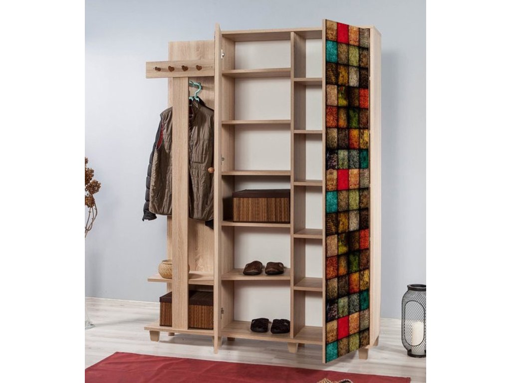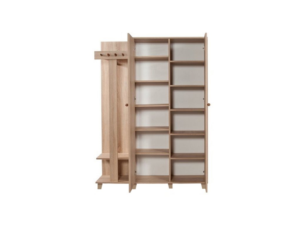 Sestava poskytuje dostatek prostoru pro organizaci vaší předsíně. Praktická skříň nabízí místo na oblečení a doplňky, zatímco věšák umožňuje snadné zavěšení kabátů či tašek. Design s kovovými a provazovými úchytkami dodává sestavě jedinečný vzhled.
