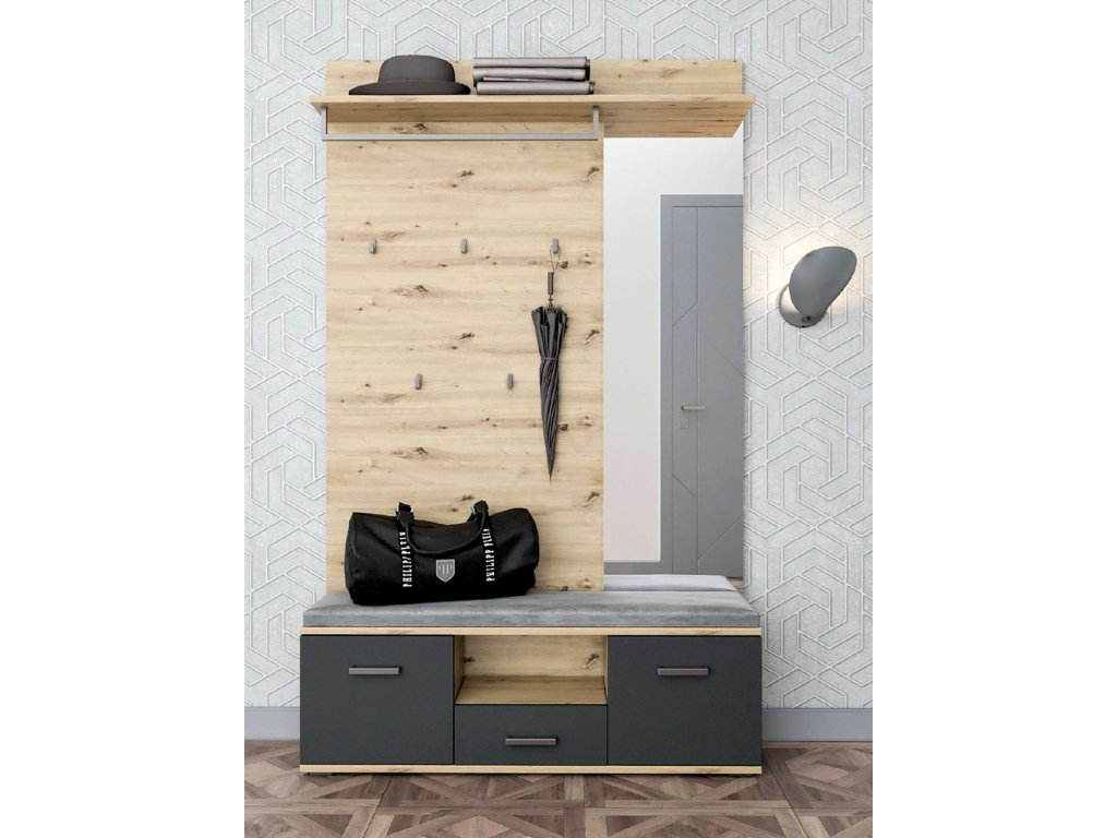 O stylový design Vaší vstupní části se postará moderní předsíňová sestava s čalouněným podsedákem v ekokůži. Kombinace moderních barev jako dub Artisan v kombinaci s barvou antracit jí dodává jedinečný charakter. Za praktický rozměr sestavy jsou zodpovědné úložné prostory v podobě dvou uzavřených skříněk, otevřená police a také zásuvka pod ní. Snadný přístup ke kabátům zajišťují četné věšáky, které jsou připevněny k dekorativnímu panelu, ale také věšáková tyč upevněná pod vrchní odkládací policí.