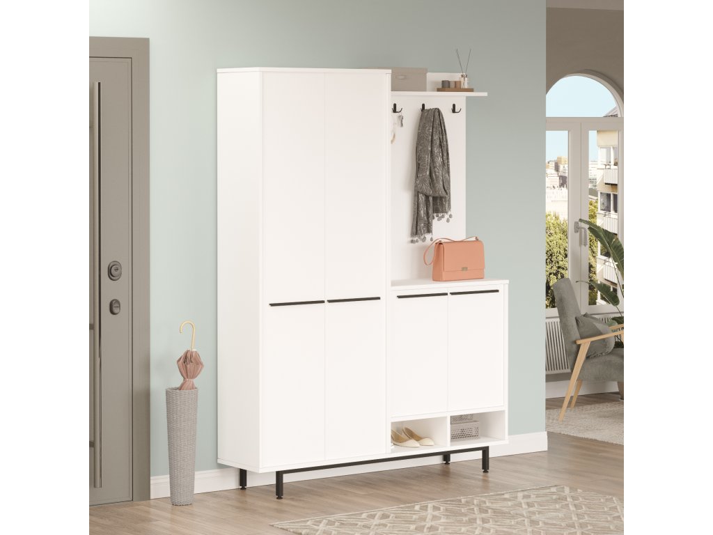 Sestava je ideálním řešením pro organizaci a estetiku vaší předsíně. Vyrobena z kvalitního LTD materiálu, nabízí odolnost, praktické využití a elegantní design. Díky svému vysokému provedení a promyšlené sestavě zahrnující věšákovou stěnu, policovou skříň a botník poskytuje dostatek úložného prostoru pro všechny potřeby.