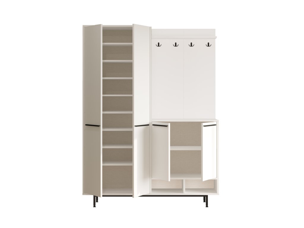 kombinuje funkčnost a moderní design. Věšáková stěna poskytuje prostor pro zavěšení kabátů a tašek, policová skříň zajistí místo pro obuv, doplňky nebo sezónní vybavení, a botník nabízí organizované uskladnění bot. Sestava nejen optimalizuje využití prostoru, ale zároveň dodává vaší předsíni elegantní a čistý vzhled.