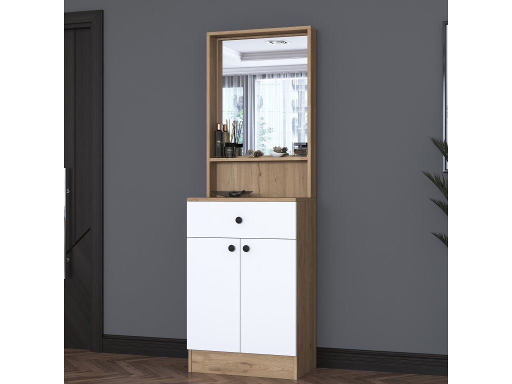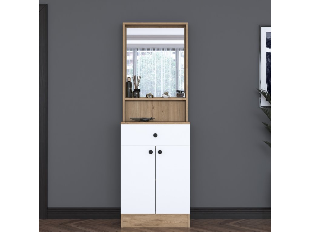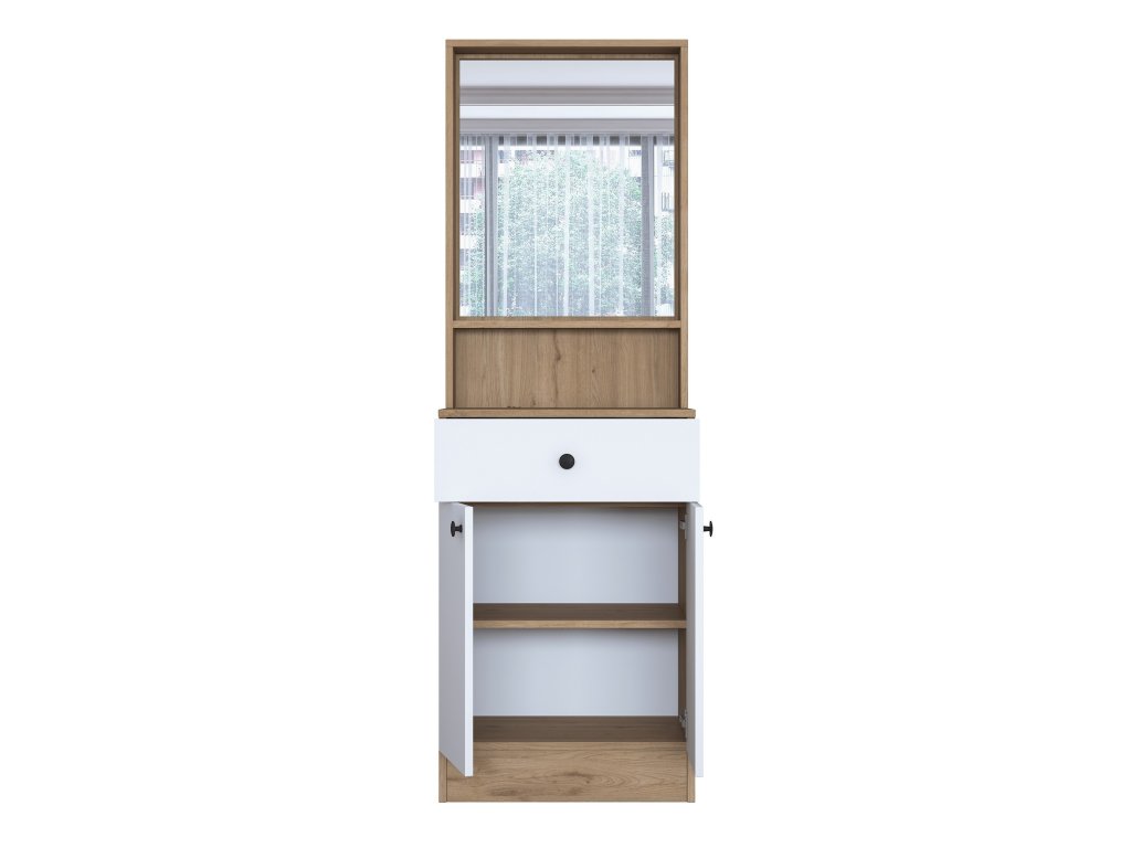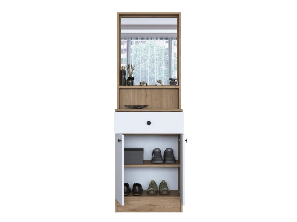 Tato předsíňová sestava nabízí praktické uspořádání prostoru. Skříňka na boty poskytuje dostatek úložného místa pro obuv, zatímco elegantní zrcadlo opticky zvětšuje prostor a zvyšuje světlost místnosti. Díky jedné zásuvce máte navíc prostor na klíče, doplňky nebo další drobnosti, které potřebujete mít vždy po ruce.