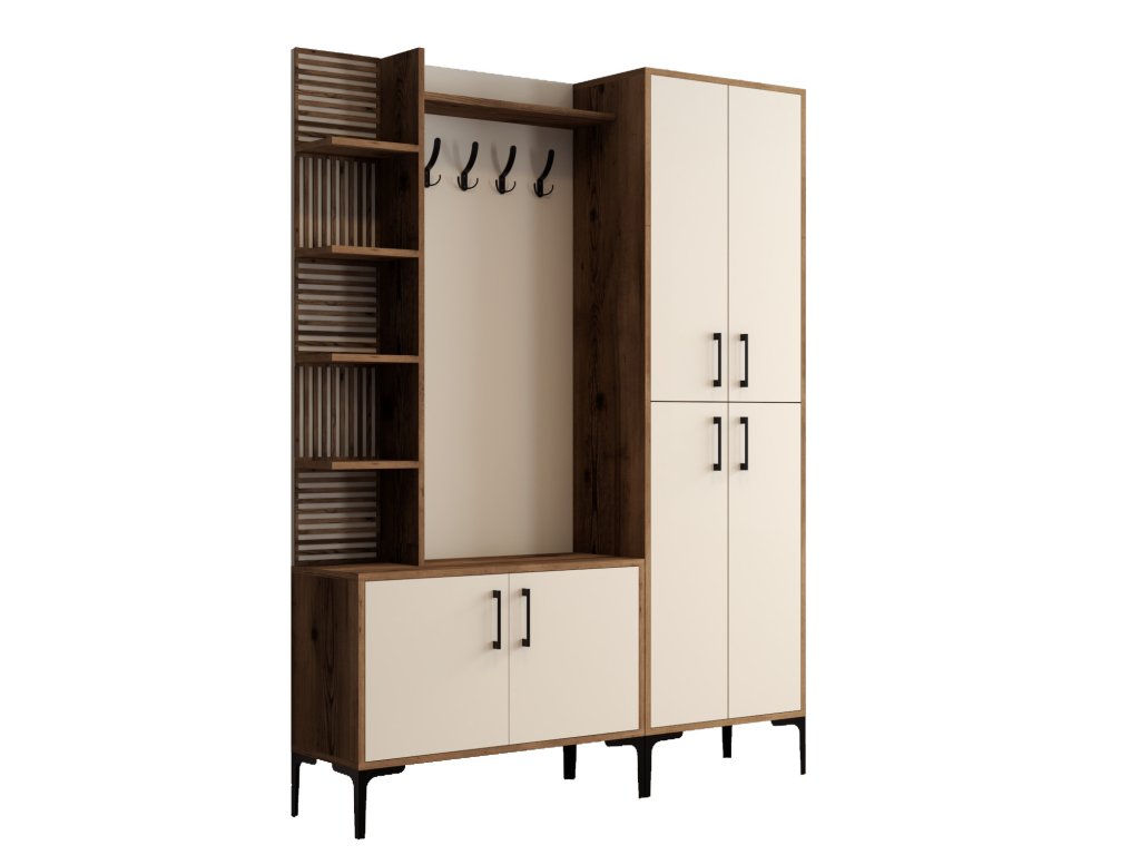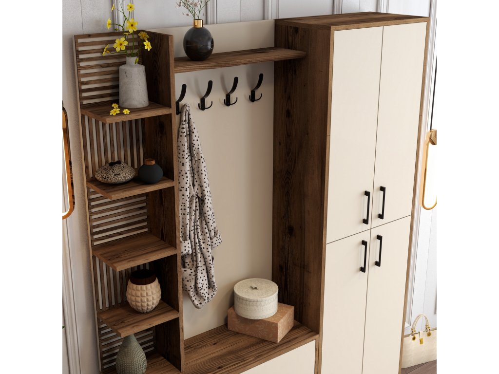 Kombinace ořechové a krémové barvy dodá každému prostoru nádech sofistikovanosti, díky čemuž je tento stojan do předsíně skutečným prvkem. Ať už máte moderní nebo industriální styl interiéru, tento kus nábytku se bez problémů začlení do vašeho domova a pozvedne jeho vzhled.