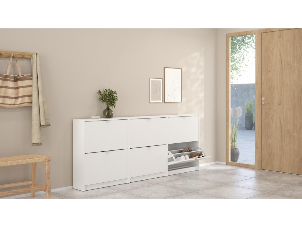 Zachraňte svou předsíň před nepořádkem a pořiďte si botník Flap s výklopnými dvířky. Botník nabízíme v několika variantách, které můžete různě kombinovat a jen na Vás a Vašem prostoru záleží kolik si těchto botníků koupíte a jak si je uspořádáte. V tomto případě se fantazii meze nekladou. Pro inspiraci jsou přiloženy fotografie s vyobrazením, jaké jsou možnosti sestavení. Díky svému provedení pojme botník Flap opravdu velké množství bot. Do každé výklopné přihrádky můžete ukládat boty ve dvou řadách. Vaše předsíň pak bude stále uklizená a zakopávání o boty se stane minulostí. Botník je vyrobený z lamina, které je odolné a snadné na údržbu a nabízíme ho v několika barevných provedeních. Je dodávaný v demontu a součástí balení je montážní návod včetně všech spojovacích prvků. Cena je uvedena za 1 kus botníku Flap se dvěmi výklopnými přihrádkami. Vyobrazené doplňky a dekorace nejsou v ceně.