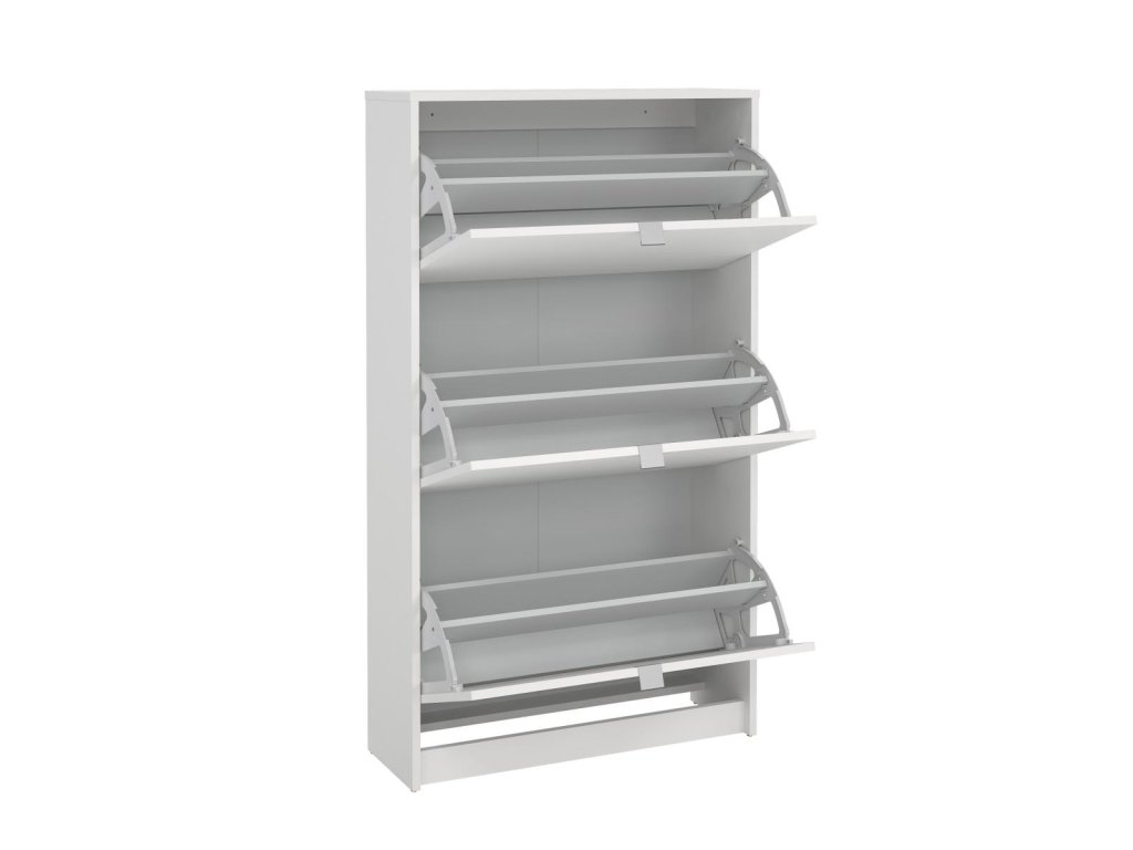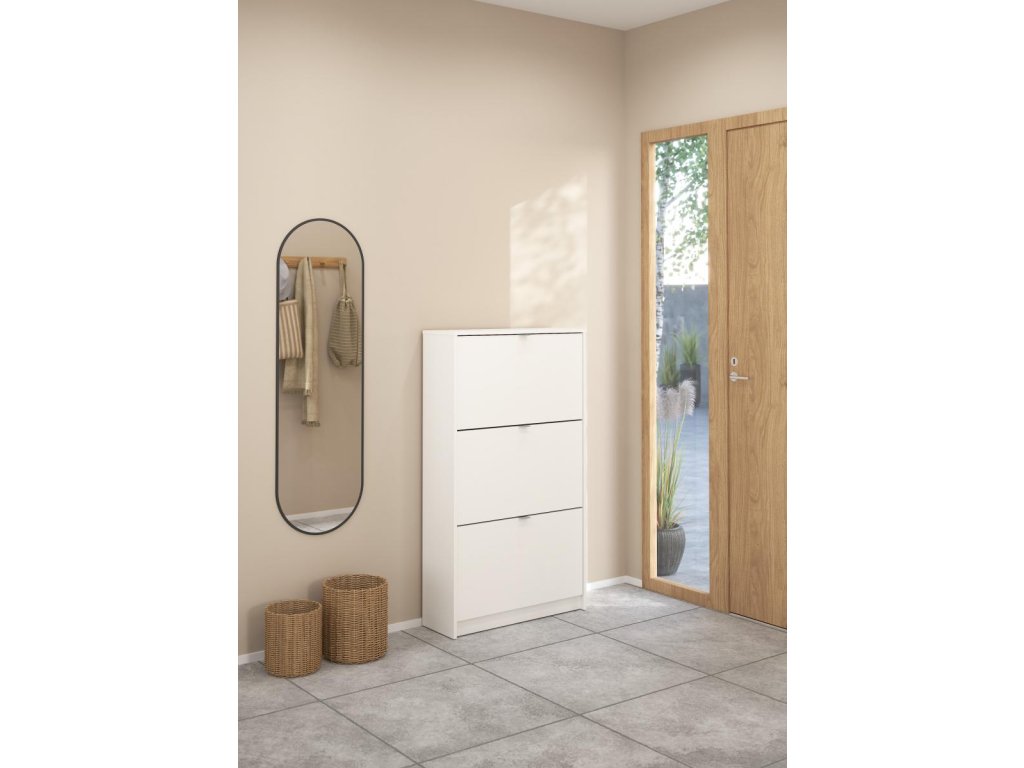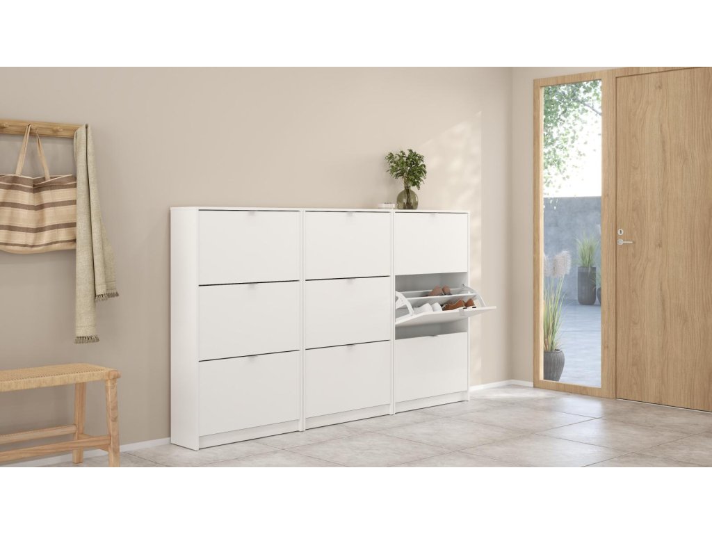 Zachraňte svou předsíň před nepořádkem a pořiďte si botník Flap s výklopnými dvířky. Botník nabízíme v několika variantách, které můžete různě kombinovat a jen na Vás a Vašem prostoru záleží kolik si těchto botníků koupíte a jak si je uspořádáte. V tomto případě se fantazii meze nekladou. Pro inspiraci jsou přiloženy fotografie s vyobrazením, jaké jsou možnosti sestavení. Díky svému provedení pojme botník Flap opravdu velké množství bot. Do každé výklopné přihrádky můžete ukládat boty ve dvou řadách.Vaše předsíň pak bude stále uklizená a zakopávání o boty se stane minulostí. Botník je vyrobený z lamina, které je odolné a snadné na údržbu a nabízíme ho v několika barevných provedeních. Je dodávaný v demontu a součástí balení je montážní návod včetně všech spojovacích prvků. Cena je uvedena za 1 kus botníku Flap se třemi výklopnými přihrádkami. Vyobrazené doplňky a dekorace nejsou v ceně.