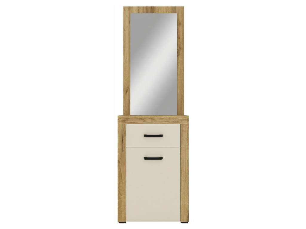 Skříň jednodveřová se zásuvkou a zrcadlem je vyrobena z desky LTD, korpus je v barvě dub kraft zlatý, dvířka jsou v barvě vanilka. Dodáváme v demontovaném stavu.Dodatočné parametre
