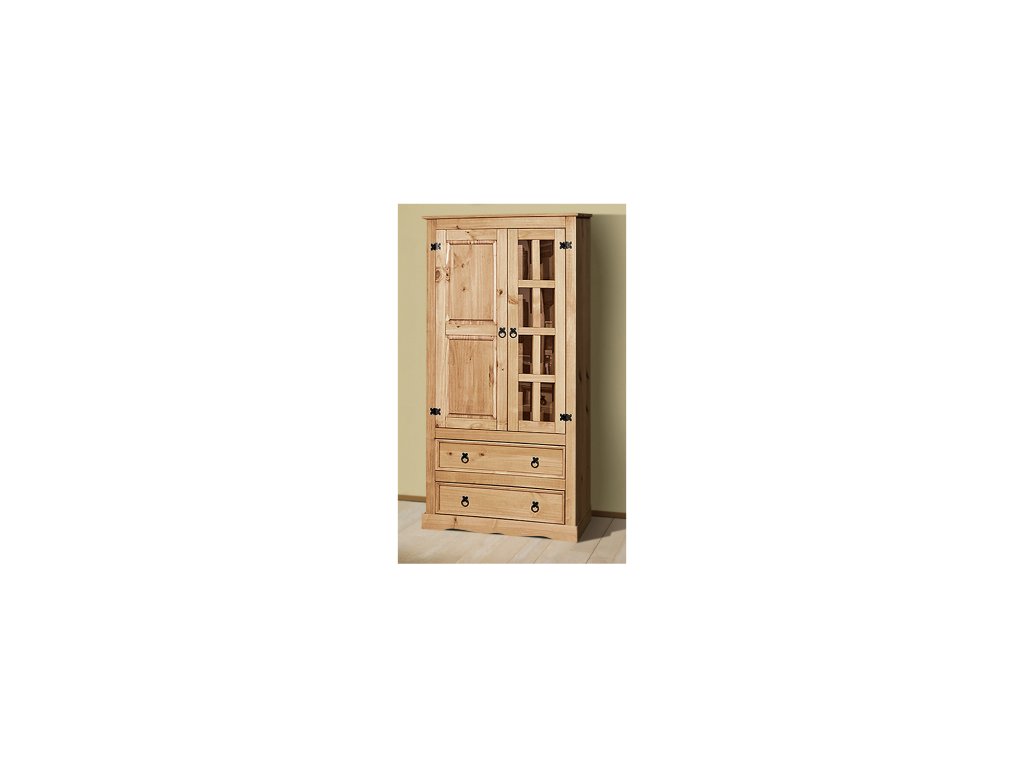 materiál masiv borovice voskovaná v medovém odstínu prosklená část, 3 police, 1 plná dvířka, 2 velké zásuvky hloubka zásuvky 32 cm, kovové ozdobné úchytky součást sestavy CoronaDodatočné parametre
