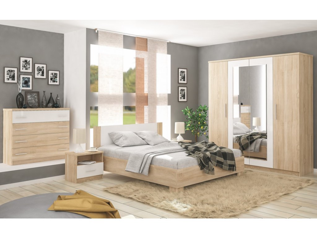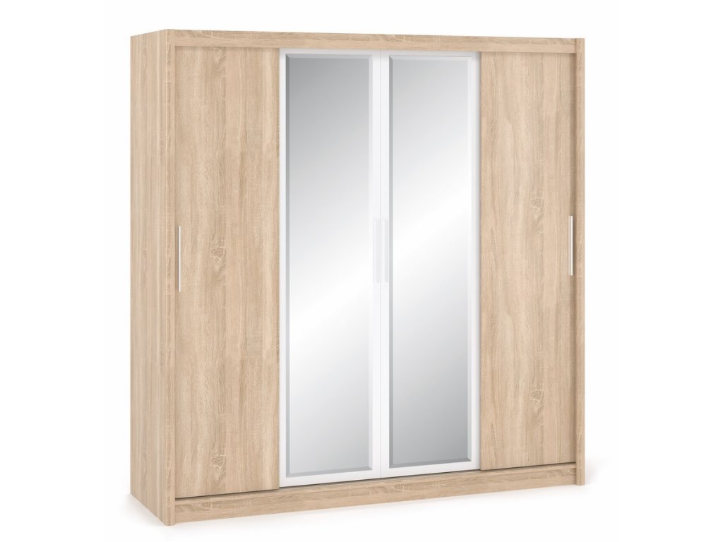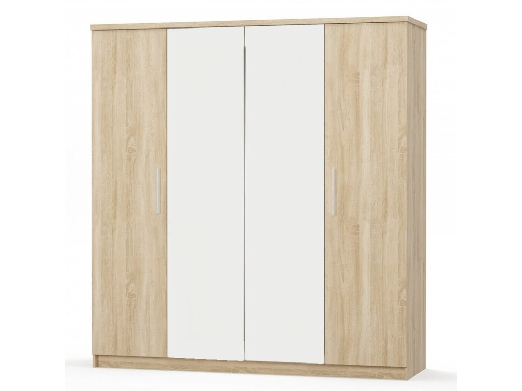 Šatní skříň čtyřdveřová z ložnicové řady. Moderní provedení v barvě dub sonoma v kombinaci s bílou dokonale doplní váš interiér. Skříň obsahuje praktická zrcadla. Je vyrobena z kvalitní LTD desky. Nabídka komponentů této sektorové řady umožňuje sestavit si nábytek do ložnice nebo studentského pokoje dle vlastních představ. Dodáváme v demontovaném stavu.Dodatočné parametre