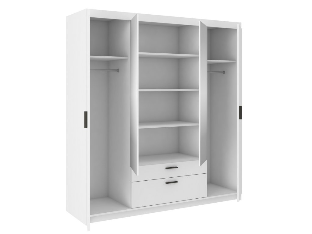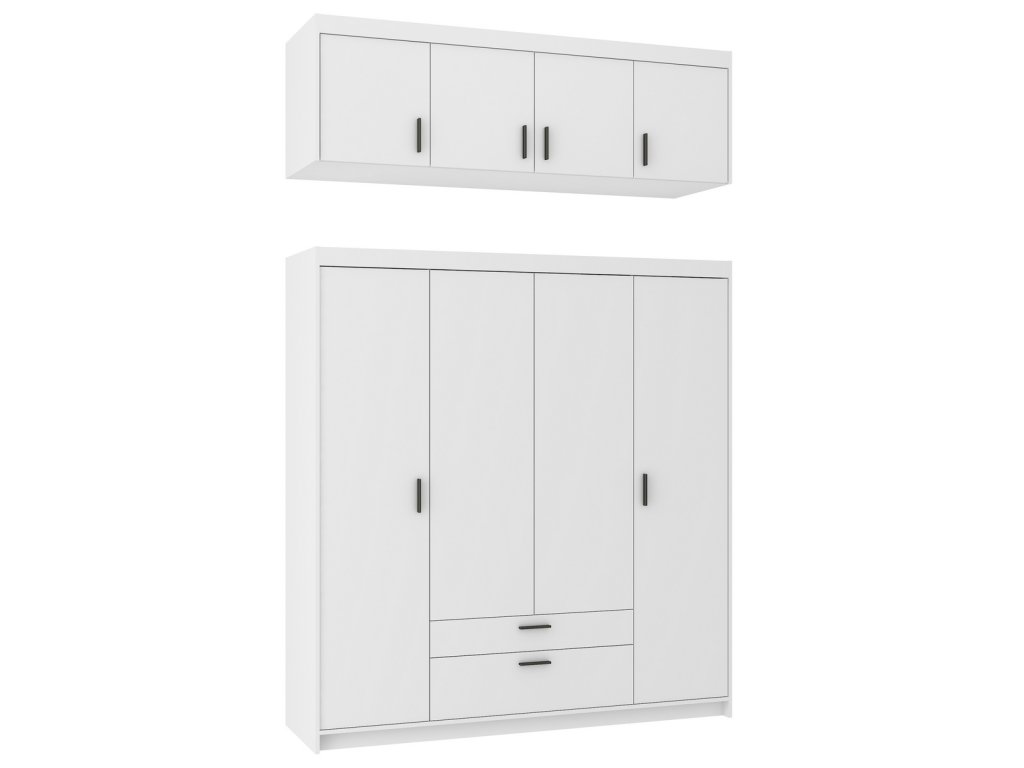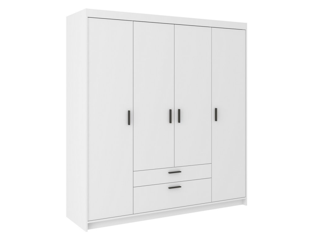 Šatní skříň ve stylovém, ale velmi praktickém provedení. Nábytek je vyrobený z lamina v barvě bílá mat. Lamino je odolné proti poškrábání, poškození, vlhkosti a vysokým teplotám. Vnitřní prostor vyobrazen na perokresbě. Možnost dokoupení nádstavce nad skříň. Dodáváme v demontovaném stavu.Dodatočné parametre