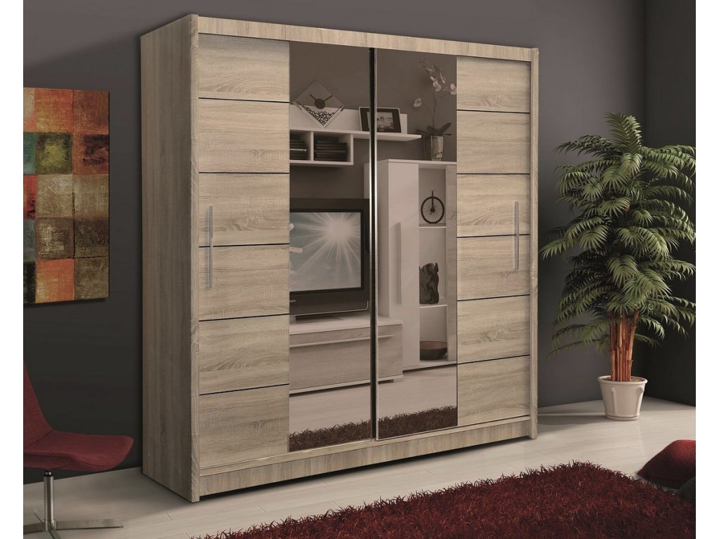 Šatní skříň s posuvnými dveřmi v moderním provedení. Korpus i dvířka jsou z kvalitního LTD v barvě dub sonoma. Dveře obsahují praktické kouřové zrcadlo. Uspořádání polic viz. perokresba. Dodáváme v demontovaném stavu.Dodatočné parametre