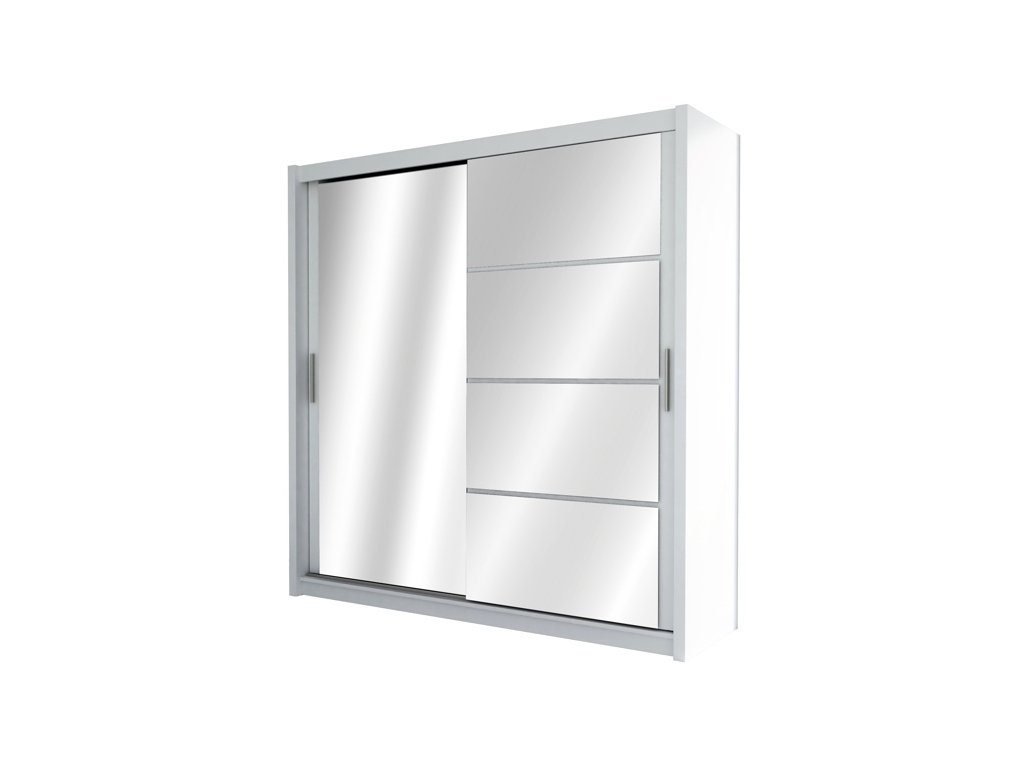 Šatní skříň s posuvnými dveřmi v moderním provedení. Korpus i dvířka jsou z kvalitního LTD v barvě bílá. Levé dveře mají zrcadlo, pravé bílé sklo. Uspořádání polic viz. perokresba. Dodáváme v demontovaném stavu.Dodatočné parametre