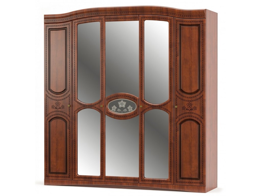 Šatní skříň pětidvéřová se zrcadlem z ložnicové řady. Barevné provedení v odstínu třešeň jen potrhuje osobitost této řady. Oblé tvary a ozdobné ornamenty dodávají jedinečnost a originalitu v naší nabídce. Vyrobeno z kvalitní MDF desky. Tato skříň má dostatek úložného prostoru. Má dvě závěsné tyče a 12 odkládacích polic. Nabídka komponentů této sektorové řady umožňuje sestavit si nábytek do ložnice dle vlastních představ. Dodáváme v demontovaném stavu.Dodatočné parametre