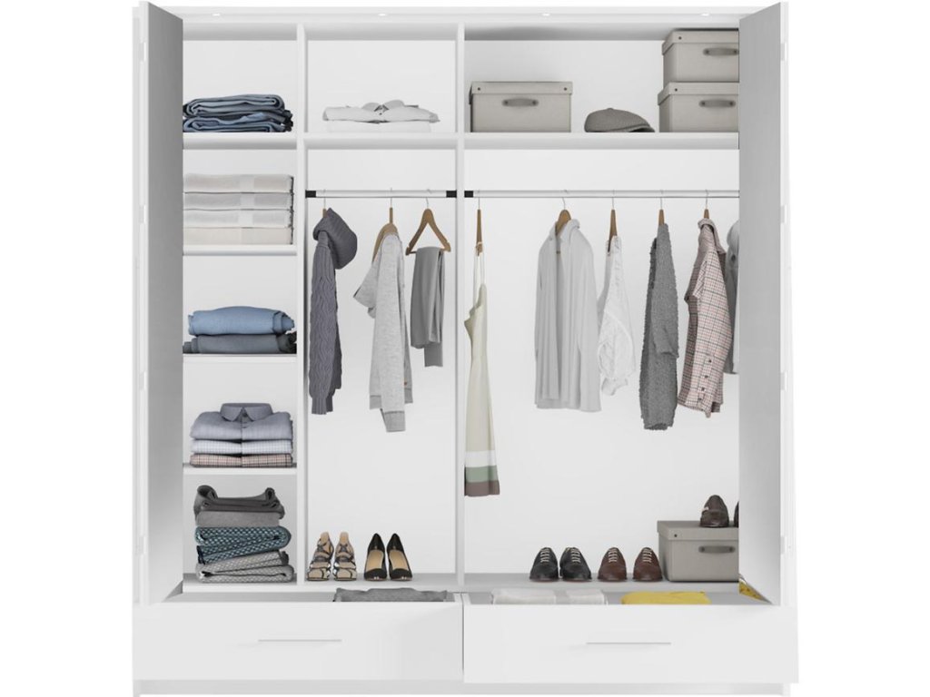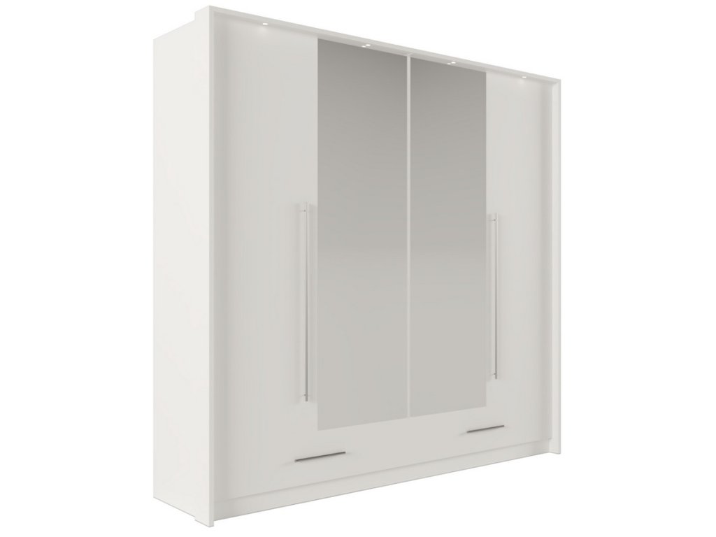 Šatní skříň s křídlovými shrnovacími dveřmi v moderním provedení. Výhodou tohoto systému dveří je volný přístup do celé skříně. Otvírání dveří zabezpečují hliníkové pojezdy Hettich. Korpus je vyroben z kvalitní LTD desky bílé barvy. Dveře jsou v barvě bílé doplněné zrcadlem. Ve spodní části skříně jsou dvě hluboké zásuvky. Skříň obsahuje praktické LED osvětlení v ceně. Uspořádání polic viz. obrázek. Dodáváme v demontovaném stavu.Dodatočné parametre