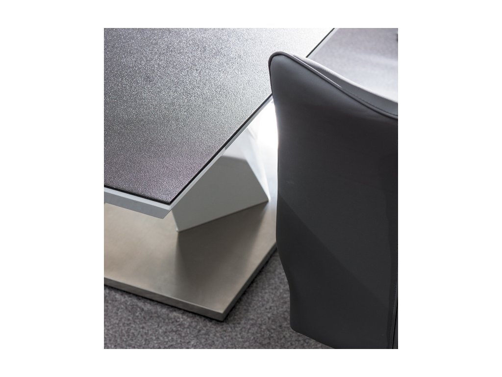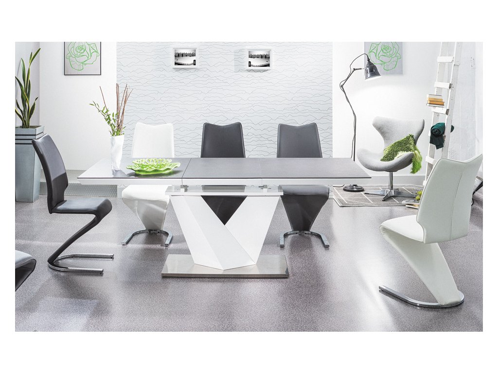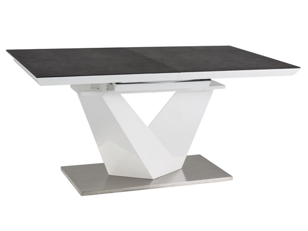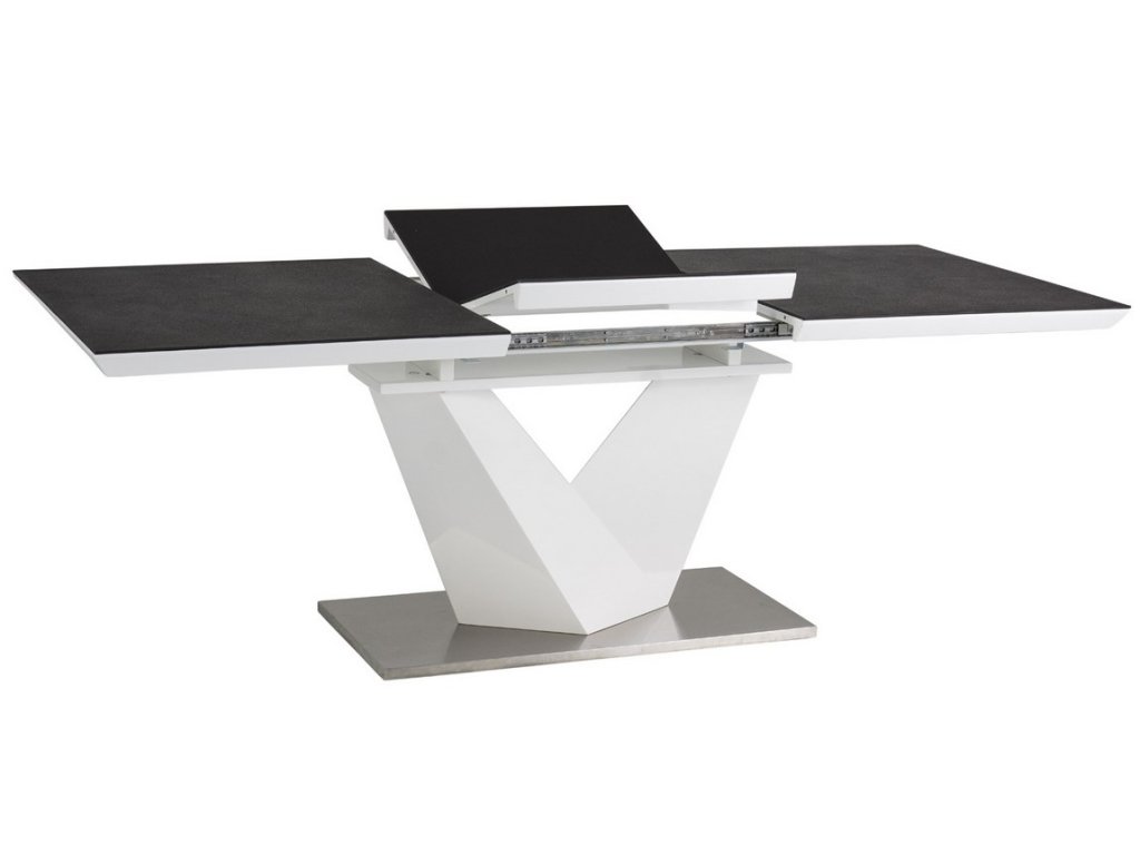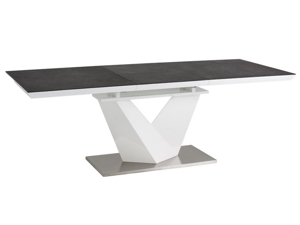 Moderní jídelní rozkládací stůl vyrobený z kvalitní MDF v bílé barvě. Podstavec je z leštěné oceli, deska stolu je bílý lesk v kombinaci s vroubkovaným tvrzeným sklem šedočerné barvy. Plocha stolu před rozložením je 80 x 120 cm, po rozložení 80 x 180 cm. Stůl je určen až pro 8 osob. K tomuto stolu doporučujeme židle v naší nabídce.Dodatočné parametre