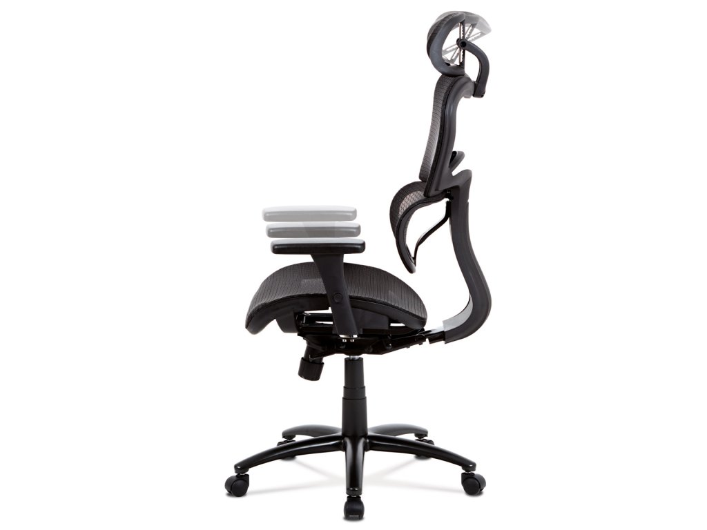 Designová kancelářská židle v kategorii TOP manager. Potah je ze síťoviny MESH v černé barvě. Synchronní mechanismus lze aretovat v několika polohách. Područky umožňují nastavit výšku i posouvat měkčené opěrky vpřed a vzad. Opěrka hlavy je horizontálně i vertikálně nastavitelná. Kříž je kovový, černý matný a kolečka univerzální. Opěrák je prodyšný a speciálně ergonomicky tvarovaný pro správné a zdravé držení zad i při náročné kancelářské práci.Dodatočné parametre