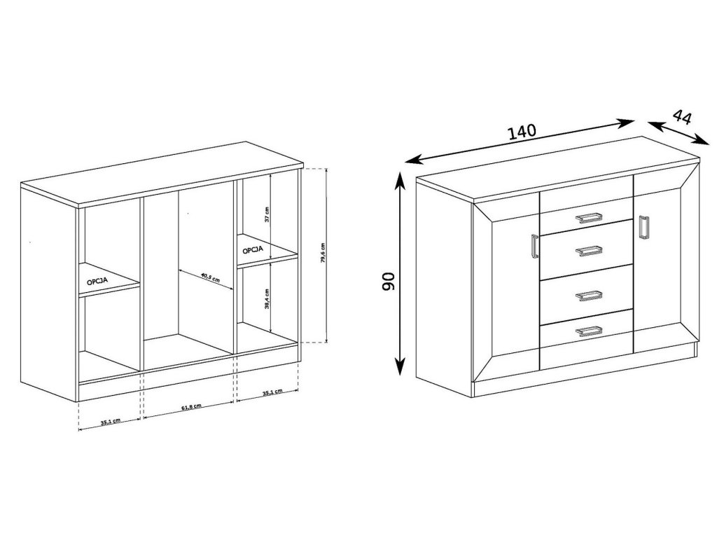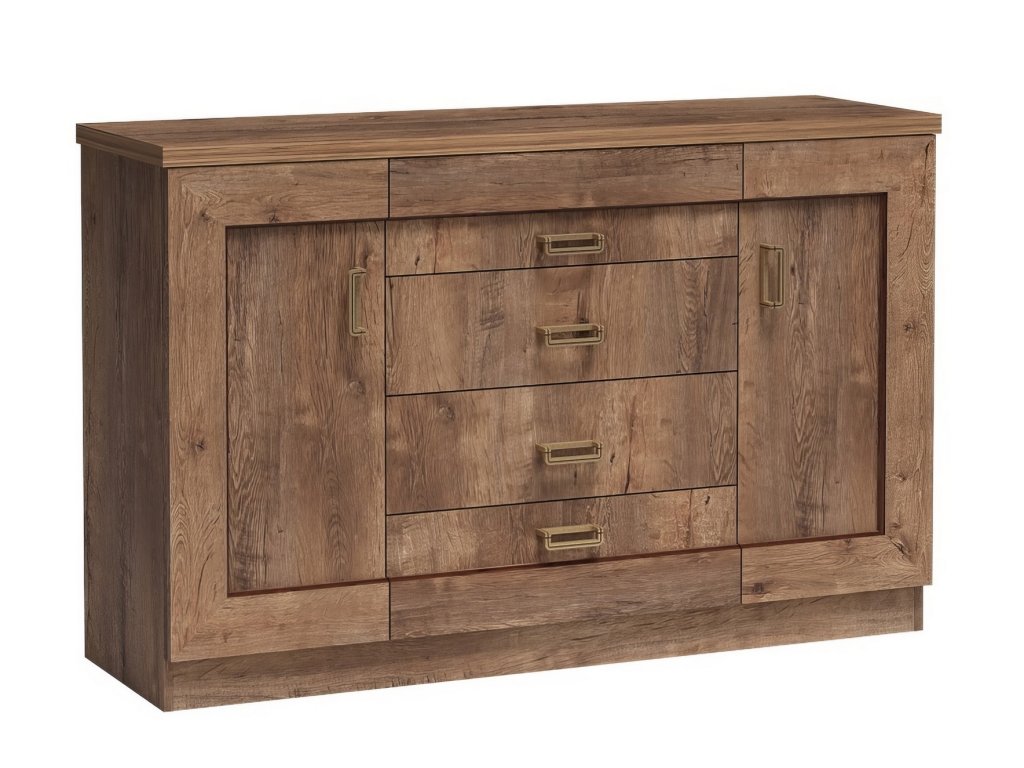 Komoda 2d4s ze sektorové řady TADEÁŠ. Komoda má 2 dvířka a 4 praktické zásuvky, za dvířky je po 1 polici. Systém TADEÁŠ je exkluzivní kolekce navržena v duchu vintage. Celá řada se vyznačuje elegancí a jednoduchými tvary, které zaručují plné využití prostoru. Nábytek je vyroben z velmi kvalitní LTD o tloušťce 16 mm, horní deska zesílena na 32 mm, lišty na čele nábytku jsou MDF, hrany ABS. Tvrzené sklo ve vitrínách je jemně zdobené. Elegantní úchyty jsou z kovu. Barevné provedení dub lefkas. Dodáváme v demontovaném stavu.Dodatočné parametre