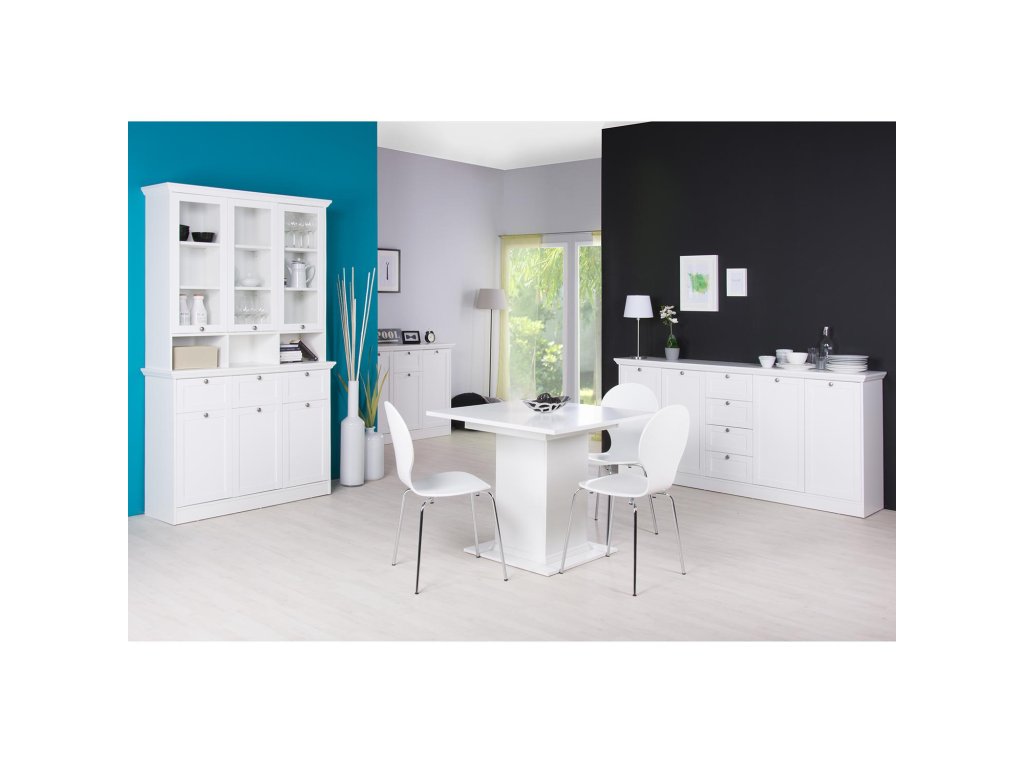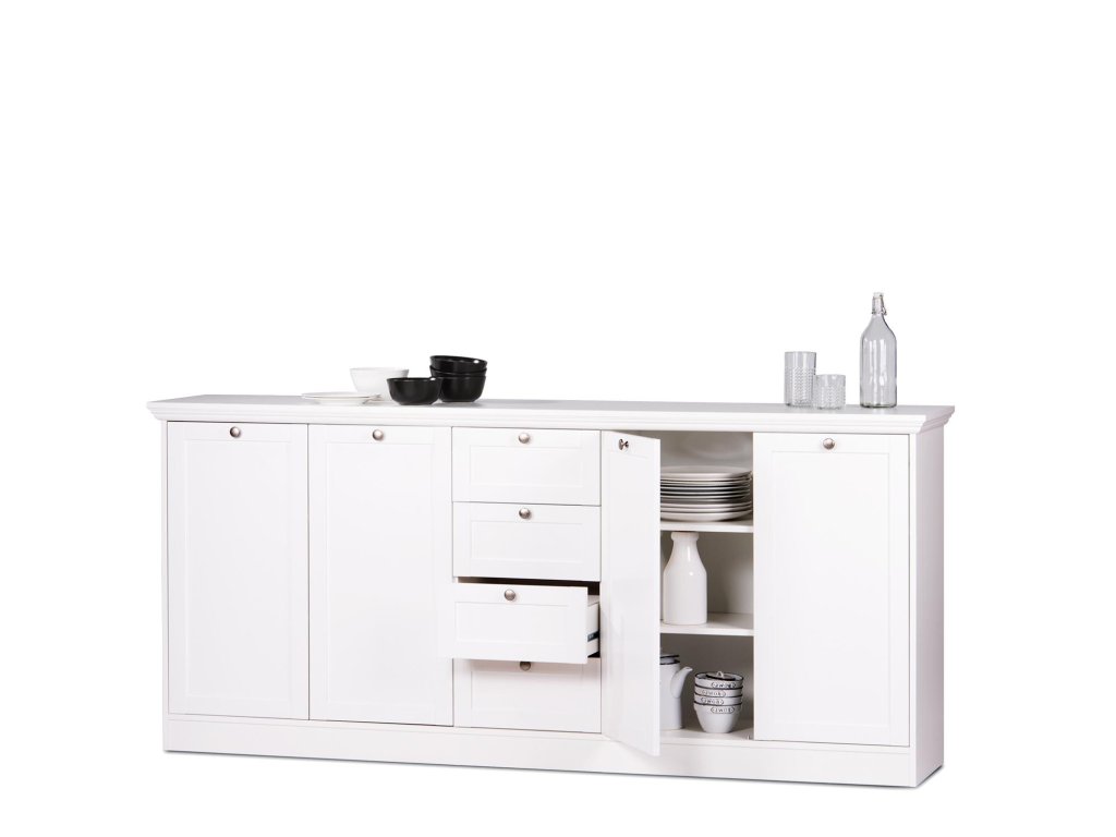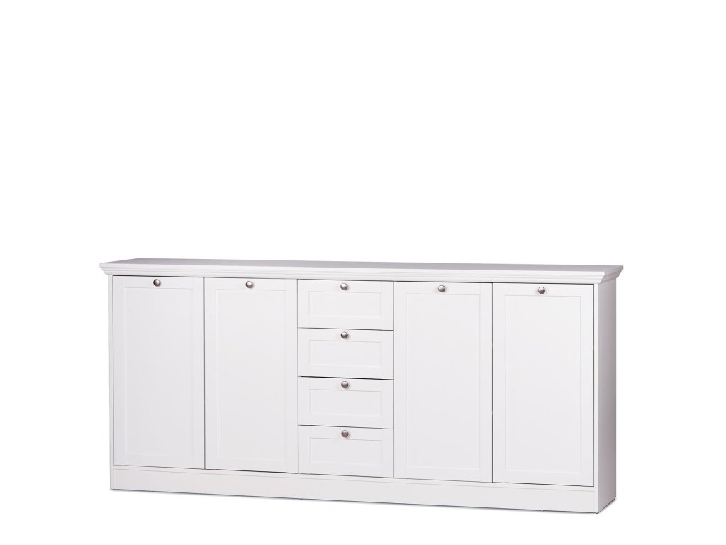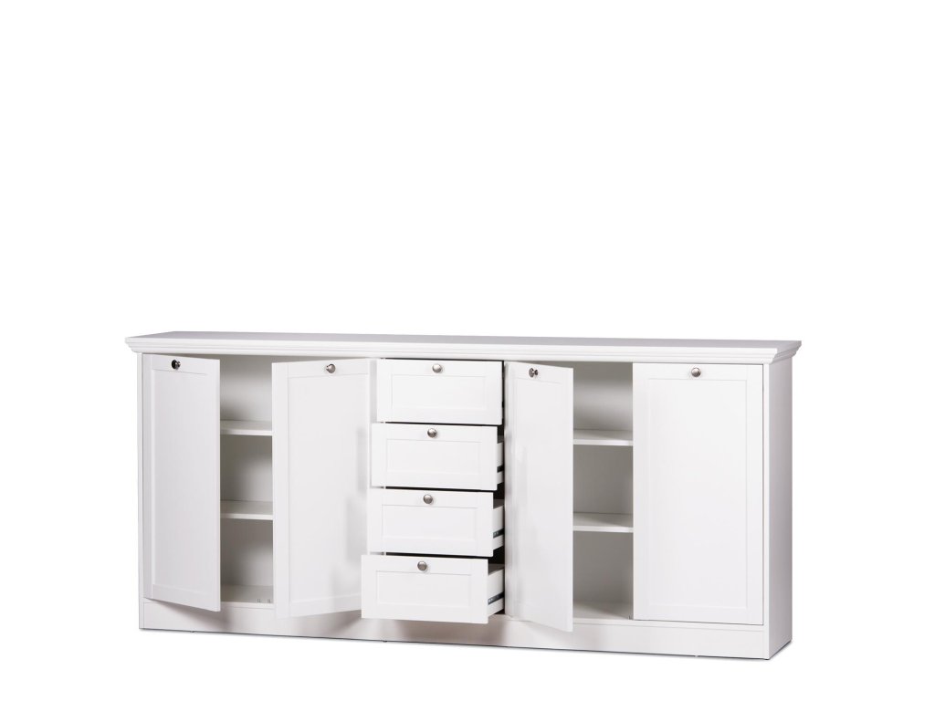 materiál kombinace MDF / lamino, barevné provedení bílá 4 dveře, 4 široké police, 4 zásuvky s kovovými pojezdy, úchytky starožitného vzhledu součást sestavy LandwoodDodatočné parametre