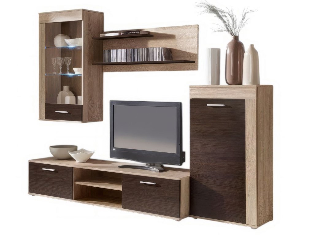 Moderní obývací stěna vhodná i do menších bytů. Tato sestava je vyrobena z kvalitního lamina. Sestava se skládá ( šířka/výška/hloubka ) - TV stolek ( 180 x 36 x 42 cm ), vitrína ( 60 x 109 x 30,5 cm ), komoda ( 60 x 111 x 30,5 cm ) a police ( 110 x 40 x 20 cm ). Korpus a část předních dvířek je barvy dub sonoma, dvířka jsou doplněna o barvu wenge. Tato stěna se prodává jako sestava, jednotlivé díly nelze koupit zvlášť. U vitríny je možnost dokoupení LED osvětlení. Dodáváme v demontovaném stavu.Dodatočné parametre