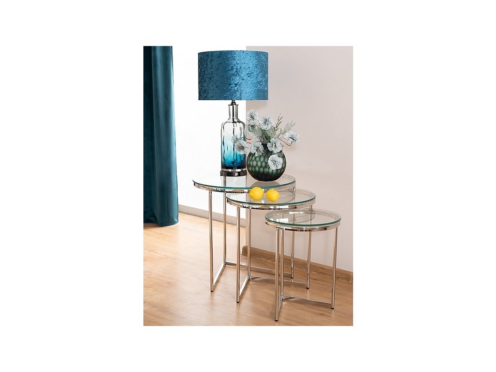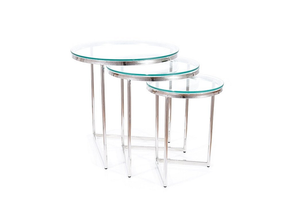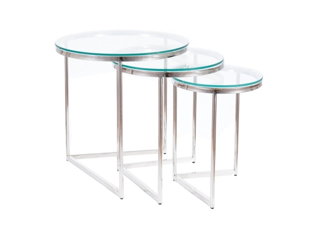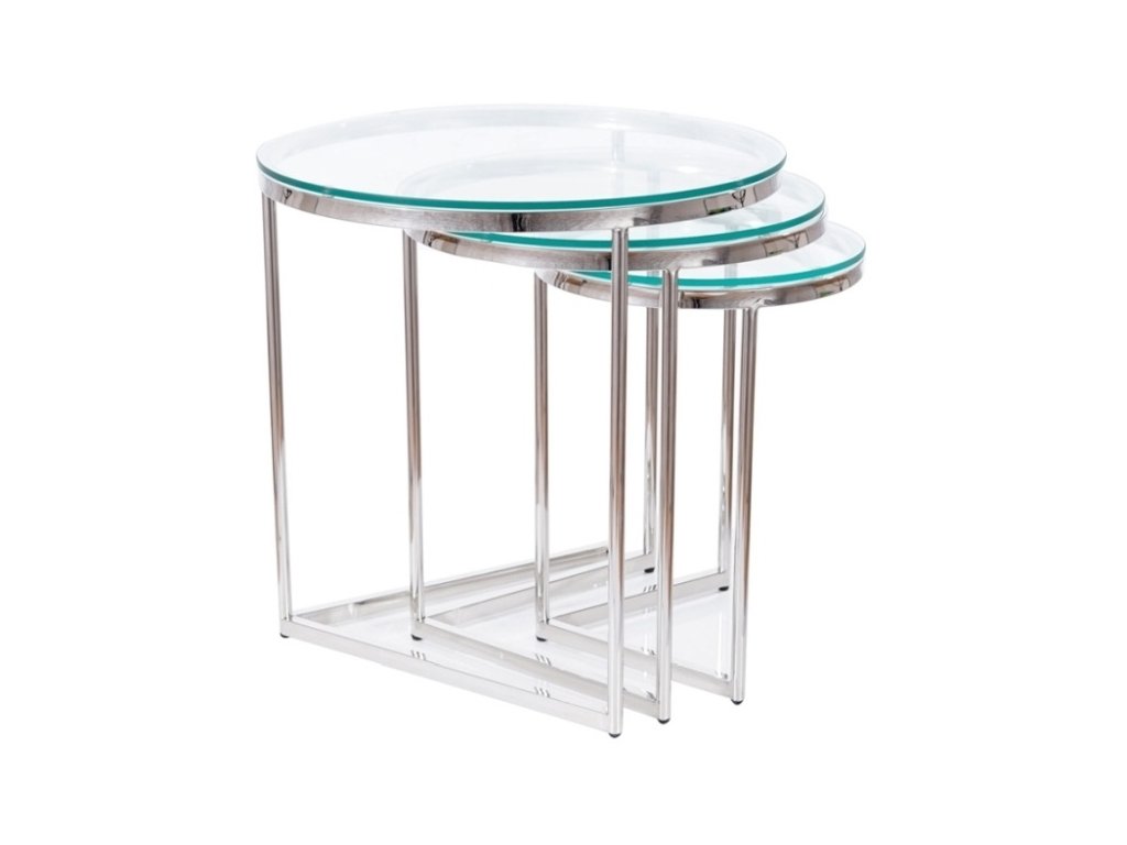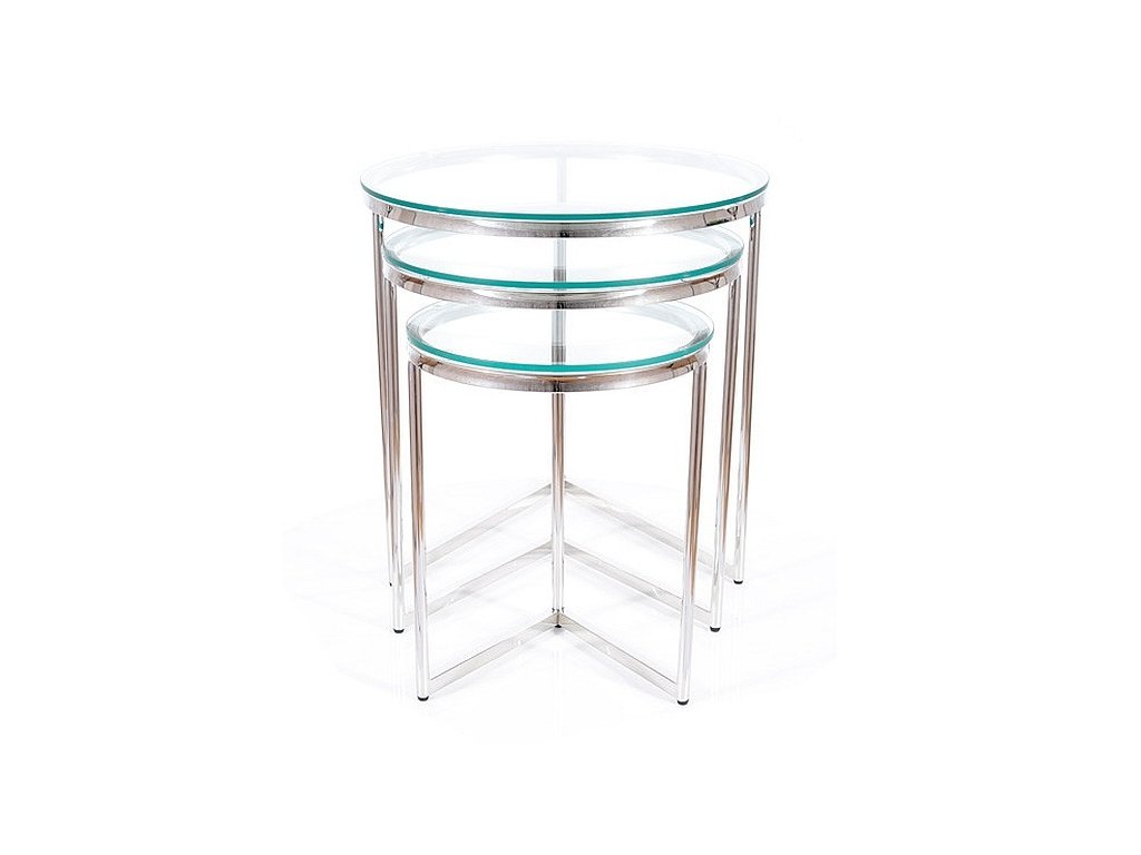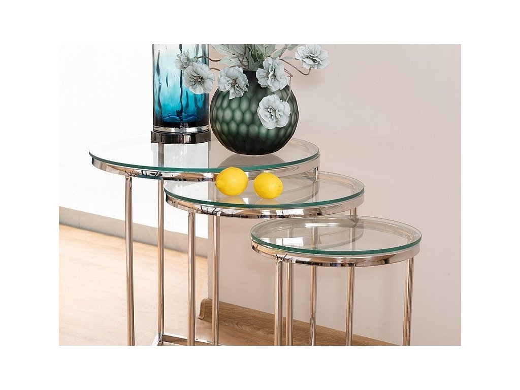 Sada tří konferenčních stolků v moderním stylu glamour. Konstrukce je z nerezové oceli ve stříbrné barvě, vrchní deska je z tvrzeného skla. Tento stylový kousek v netradičním dizajnu se bude vyjímat v každém interiéru. Dodáváme v demontovaném stavu.Dodatočné parametre