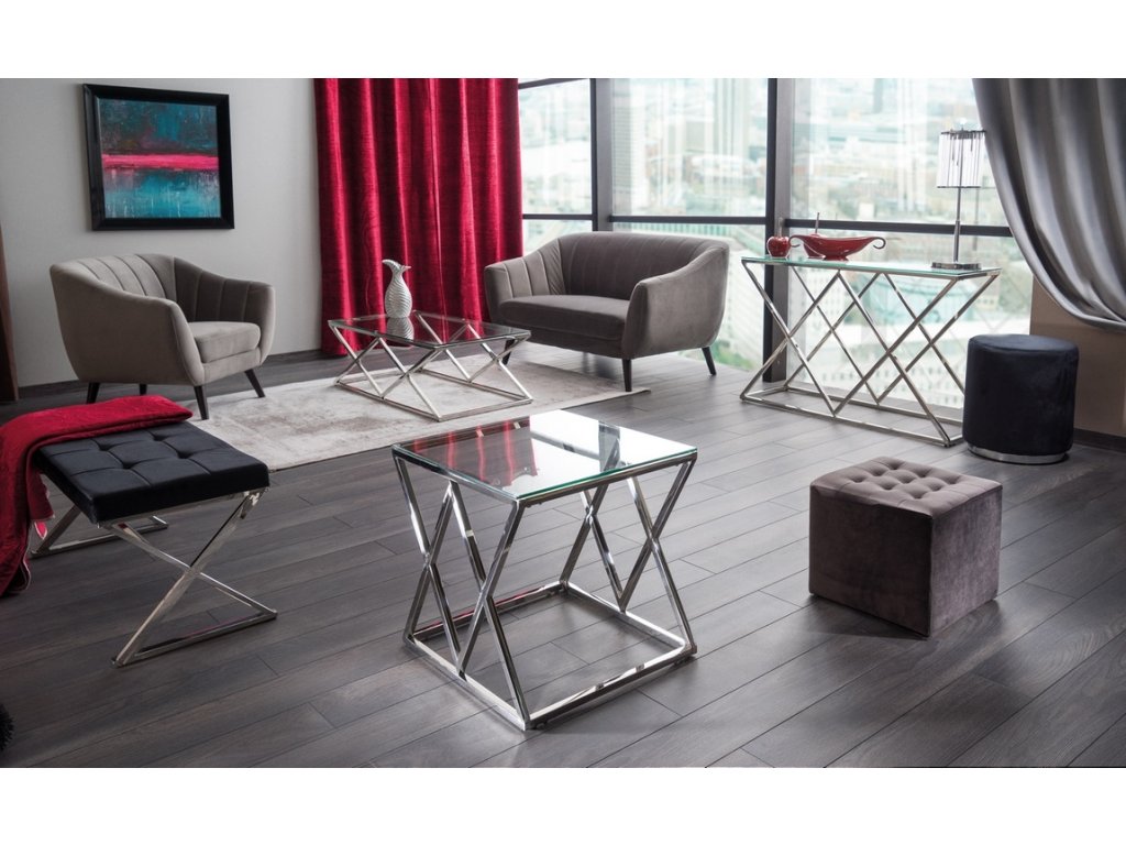 Konzolový stolek v moderním stylu glamour. Konstrukce je z kovu v barvě chróm, vrchní deska je z tvrzeného kouřového skla. Tento stylový kousek v netradičním dizajnu se bude vyjímat v každém interiéru. Dodáváme v demontovaném stavu.Dodatočné parametre