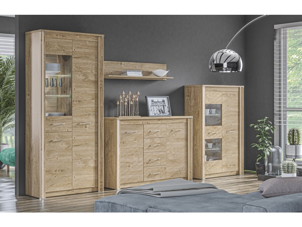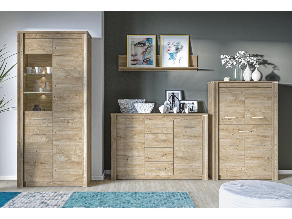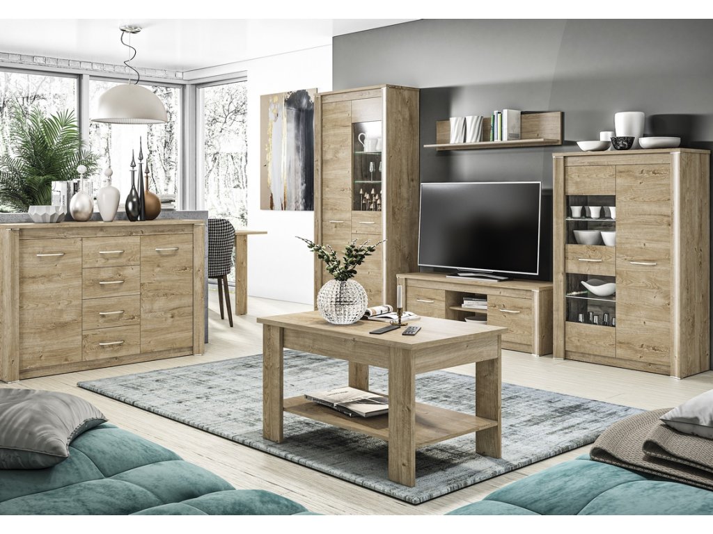 Televizní stolek je vyroben z desky LTD v barvě dub ribbeck. Nábytek je doplněn dekorativními MDF pásky se zakončovacími vložkami v barvě úchytů. Úchyty jsou chromované v barvě šampaň. Možnost dokoupení dalších segmentů. Dodáváme v demontovaném stavu.Dodatočné parametre