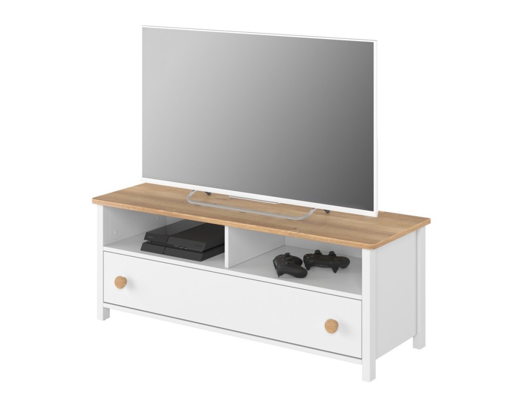 Televizní stolek se zásuvkou. Tento elegantní nábytek dodá romantickou atmosféru pokojíčku malé princezny i větší slečny. Stolek je vyroben z desky LTD v kombinaci s MDF v barvě bílé s doplňkovou barvou dub Nash ( 22 mm ). Stolek má ve spodní části zásuvku. Úchyty jsou plastové v barvě dub nash. Dodáváme v demontovaném stavu.Dodatočné parametre