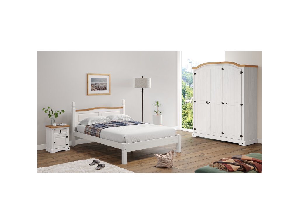 materiál masiv borovice voskovaná v bílém odstínu horní deska masiv borovice voskovaná v medovém odstínu 2 malé zásuvky, 1 police, kovové ozdobné úchytky součást sestavy Corona bíláDodatočné parametre
