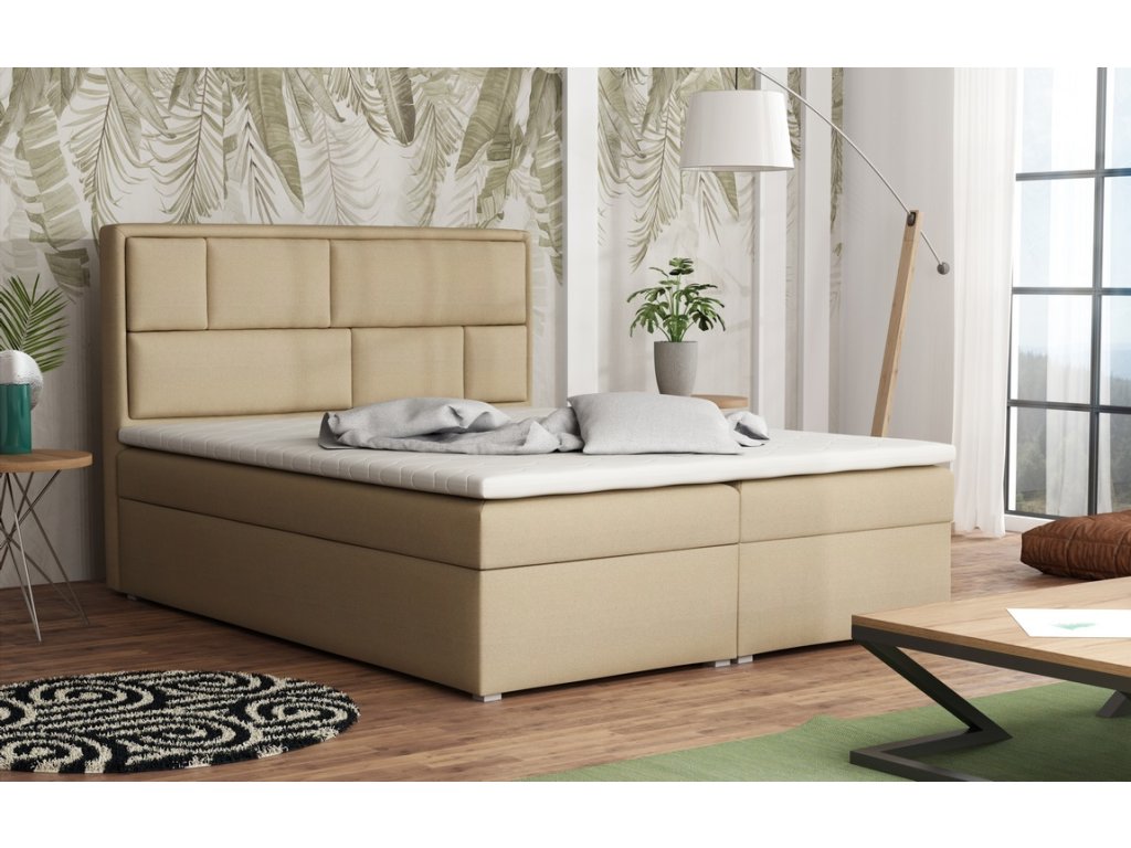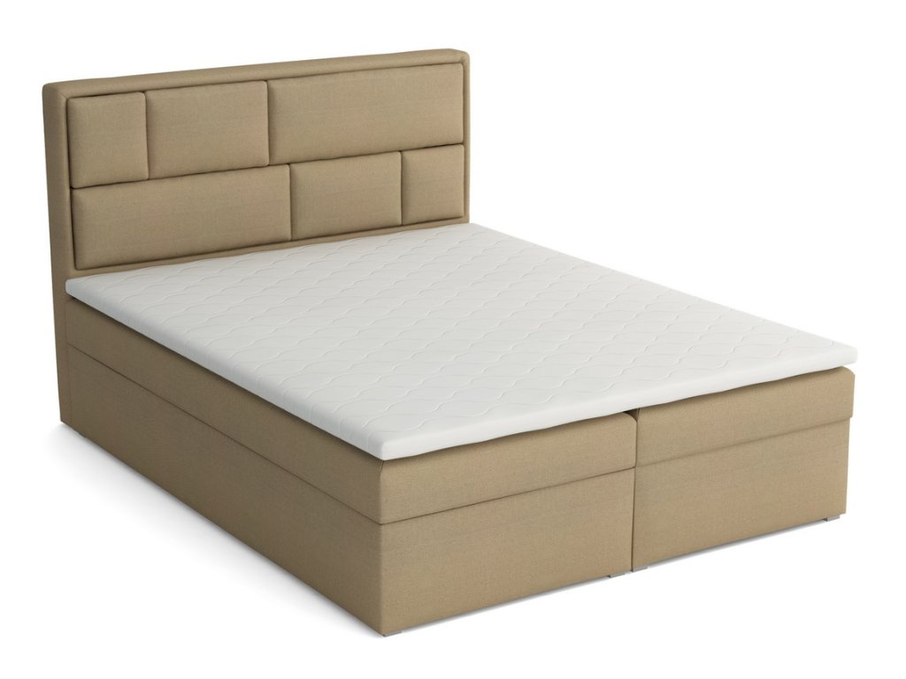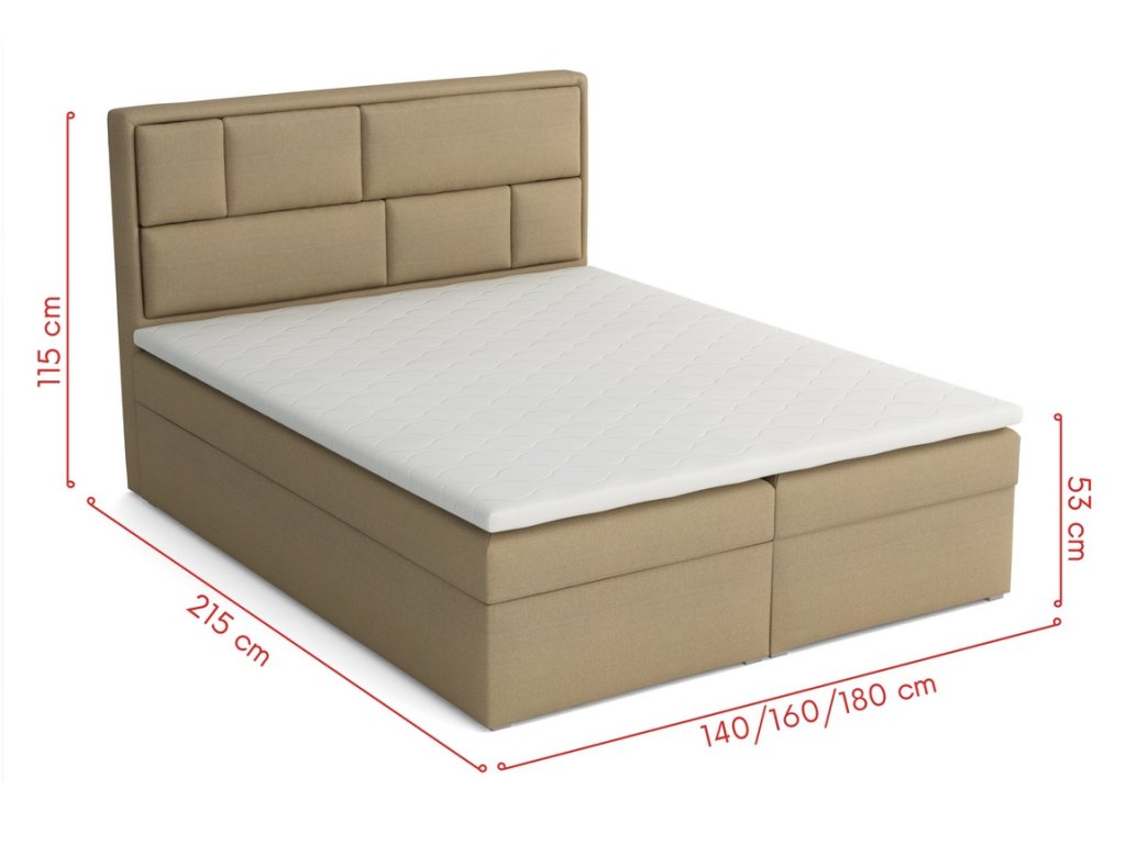 Elegantní kontinentální postel moderního vzhledu s vysokým čelem s dekoračním prošíváním. Postel se dodává zároveň s matrací - boxspring styl. Pevná konstrukce postele je potažena látkou v barvě béžové. Na ní se nachází vysoká bonelová matrace potažena stejnou látkou. Na ní je druhá tenká matrace v celku vyrobena z kvalitní hrubé PUR pěny tzv. topper (výška cca 5 cm). Ložní plocha činí 180 x 200 cm. Výška ložné plochy od země je cca 53 cm. Rozměry úložného prostoru - 2x (197x87x30 cm). Úložný prostor je k dispozici nadzvednutím matrace z boční strany postele.Dodatočné parametre