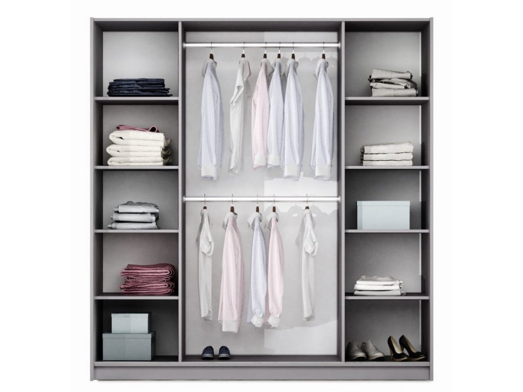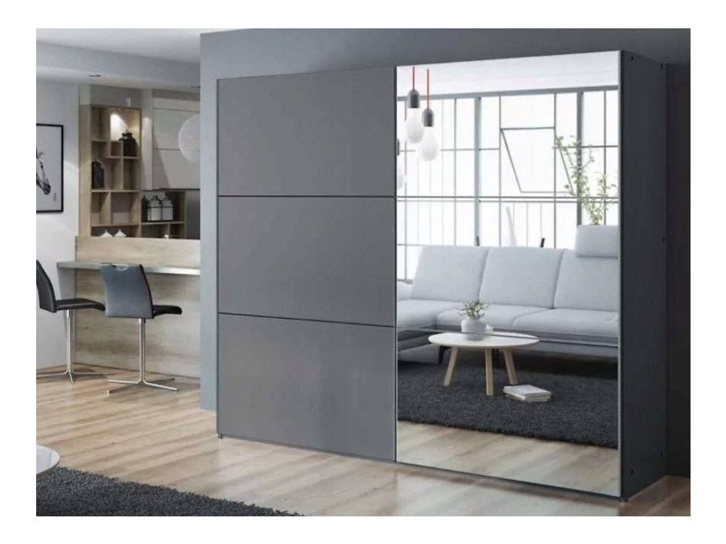 Šatní skříň s posuvnými dveřmi v moderním provedení vhodná do monochromatického interiéru. Korpus i dvířka jsou z kvalitní LTD desky grafitové barvy. Dveře jsou v barvě grafitové doplněné zrcadlem. Uspořádání polic viz. obrázek. Dodáváme v demontovaném stavu.Dodatočné parametre