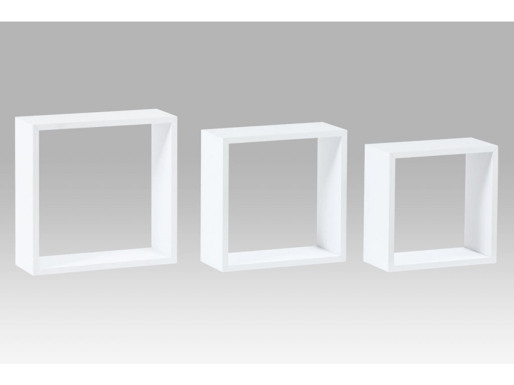 Sada 3 ks moderních nástěnných poliček různých velikostí v minimalistickém designu a čtvercového tvaru. Provedení je v bílé matné barvě s jemnou strukturou. Rám je z MDF, povrch matné lamino. Balení obsahuje poličku, šrouby a hmoždinky pro uchycení. Nosnost poličky je 5-15 kg podle druhu nosného zdiva.Dodatočné parametre