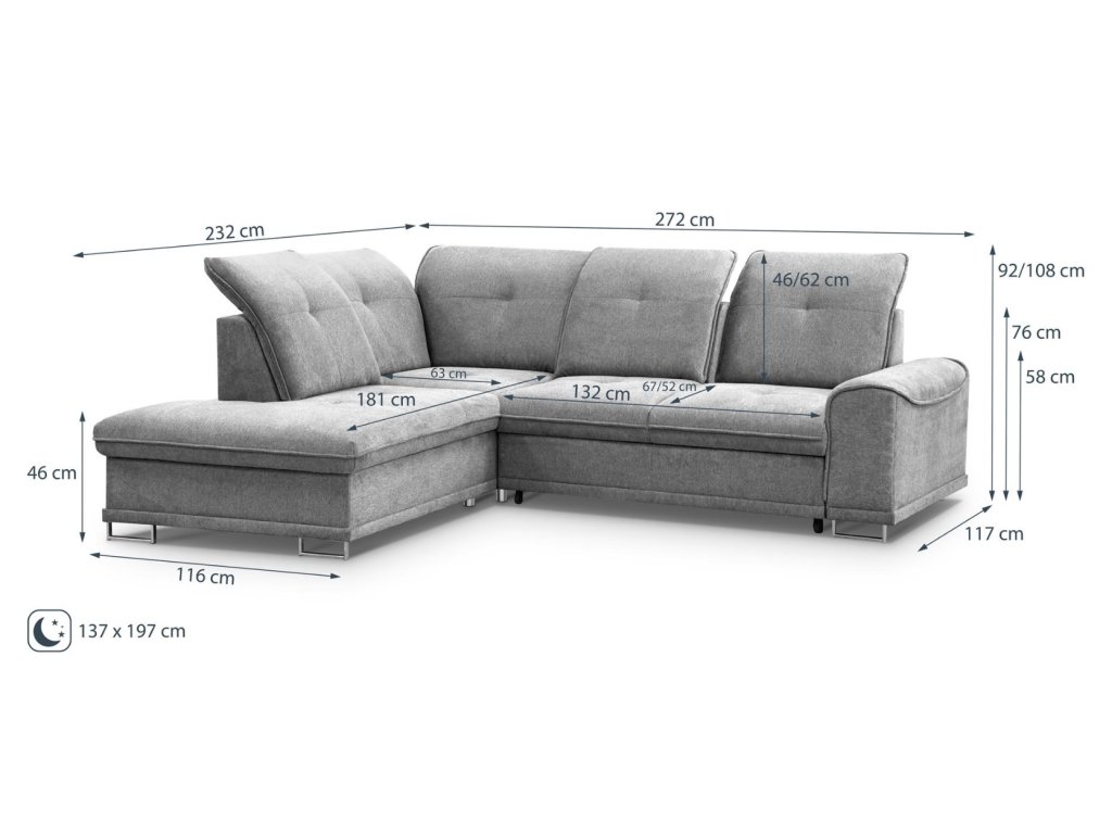 - rozměry : 272 x 232 x 92/108 cm, plocha spaní: 137 x 197 cm