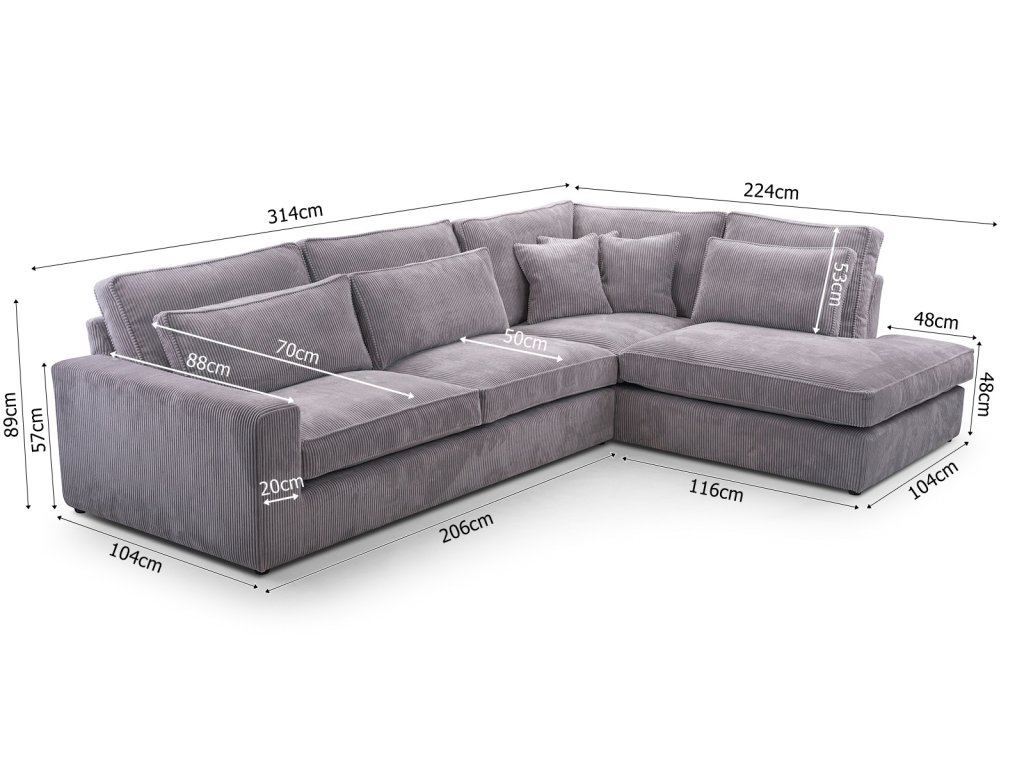 Polštáře jsou velmi pohodlnou součástí sedacích souprav. Jejich velké množství symbolizuje dokonalý relax. Sedací souprava Carny je tedy pro ty, kteří si rádi užijí relax nejen po náročném dni, skvělou volbou. Všechny polštáře jsou volně ložené a můžete je přizpůsobit svému pohodlí. Výplň sedáku tvoří pružiny typu faliste v kombinaci s pěnou T30 a HR 35/45. Sedací souprava je celočalouněná, takže ji můžete umístit do prostoru. Sedací souprava není rozkládací, ale po sejmutí polštářů, vznikne dostatečně velký prostor k občasnému přespání. Cena je uvedena za sedací soupravu včetně polštářů. Vyobrazené dekorace nejsou v ceně. Sedací soupravu nabízíme v levém, nebo v pravém provedení.