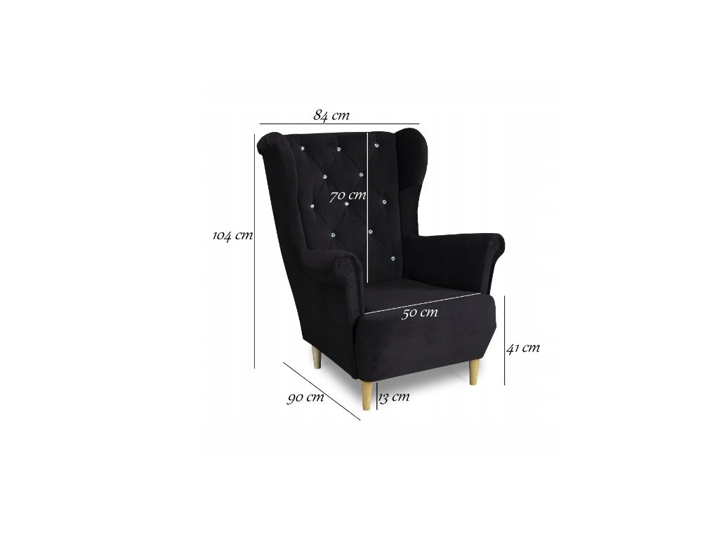 Pohodlné čalouněné křeslo v elegantním stylu bude ozdobou každého interiéru. Nožky jsou ze dřeva v barvě wenge, čalounění je z látky velvet v černé barvě (Bluvel 19). Pohodlí a elegance ve Vašem obýváku, dětském pokoji či kanceláři.Dodatočné parametre