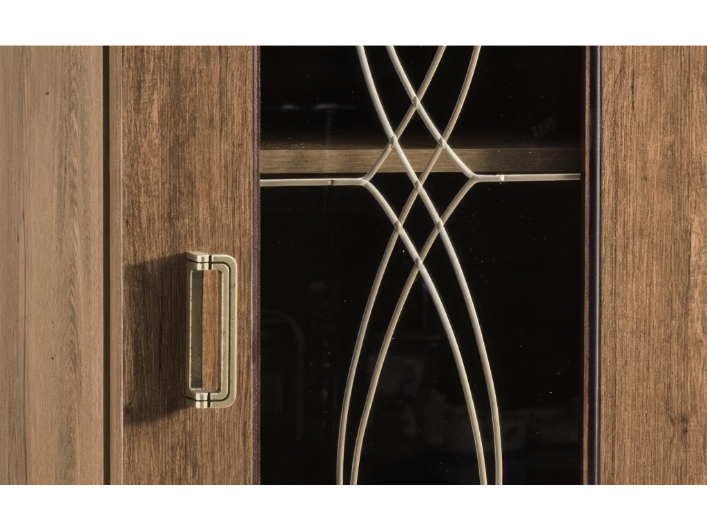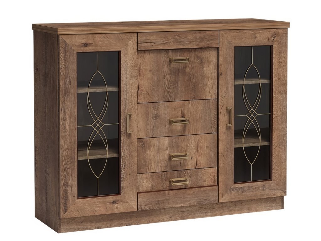 Komoda - bar ze sektorové řady TADEÁŠ. Komoda má 2 prosklená dvířka, 3 praktické zásuvky a 1 výklopná dvířka. Systém TADEÁŠ je exkluzivní kolekce navržena v duchu vintage. Celá řada se vyznačuje elegancí a jednoduchými tvary, které zaručují plné využití prostoru. Nábytek je vyroben z velmi kvalitní LTD o tloušťce 16 mm, horní deska zesílena na 32 mm, lišty na čele nábytku jsou MDF, hrany ABS. Tvrzené sklo ve vitrínách je jemně zdobené. Elegantní úchyty jsou z kovu. Barevné provedení dub lefkas. Dodáváme v demontovaném stavu.Dodatočné parametre