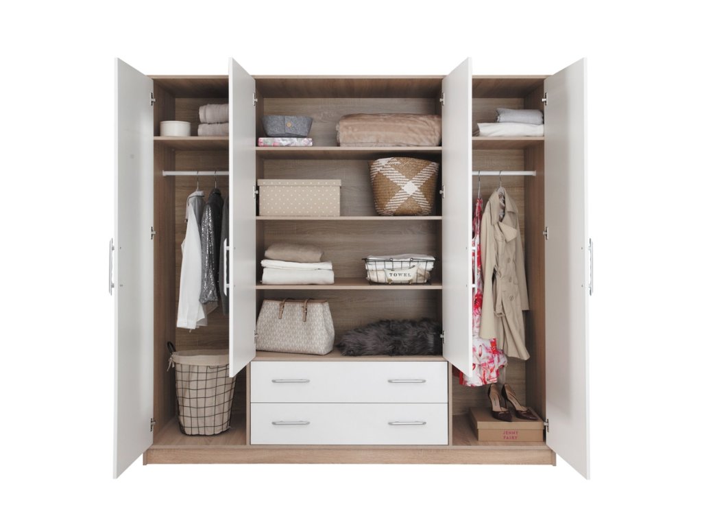 Jednoduchá a zároveň praktická šatní skříň s dostatkem úložného prostoru. S rovnými a čistými liniemi, které vytvoří útulný, pohodový a příjemný interiér. Vnitřní vybavení skříně je vyobrazeno v doplňkových fotografiích. Skříň je také vybavena praktickými zásuvkami, které můžete využít např.na spodní prádlo. Je dodávaná v demontu.