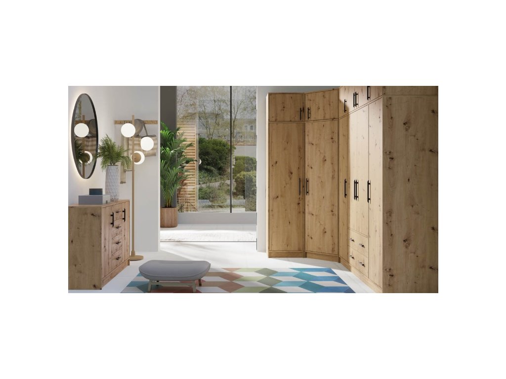 Šatní skříně a nadstavce v systému Martin nabízíme v různých rozměrech v moderní kombinaci dekoru dub artisan. Díky těmto modulům sestavíte pro vaši ložnici, pokoj, chodbu požadované úložné prostory.