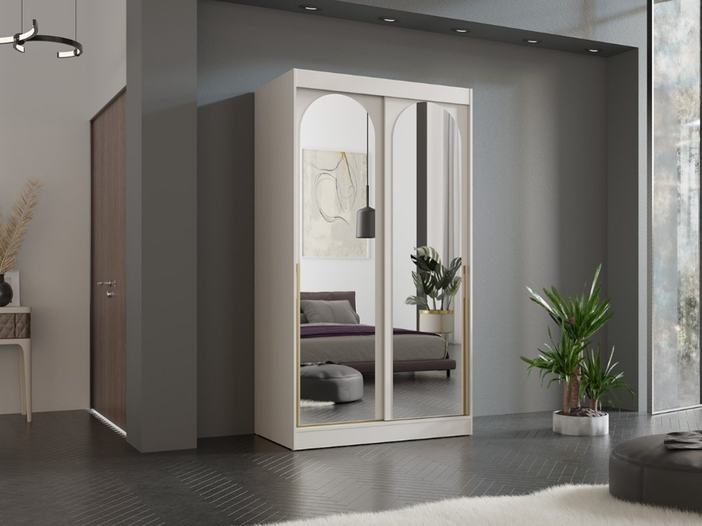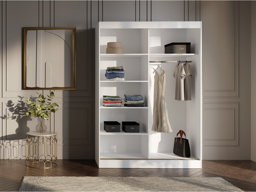 V rozměrech 120, 150, 180, 200 cm nabízí opravdu štědrý úložný prostor pro oblečení, doplňky i sezónní věci – všechno tak budete mít přehledně na jednom místě. Velké zrcadlo na přední části skříně nejen vizuálně zvětší místnost, ale zároveň usnadní každodenní přípravy.