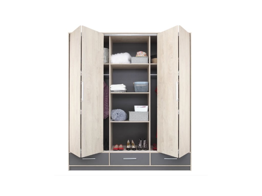 Moderní šatní skříň Sansa, která se hodí absolutně kamkoliv. Kvalitní zpracování a perfektní design. Praktičnost si získala svými skládacími dveřmi, které při otevření zobrazí celý úložný prostor skříně. Ve spodní části skříně naleznete tři zásuvky na uložení spodního prádla. Dominantou skříně je výška 230cm, tím pádem vám vznikne ještě větší úložný prostor a nemusíte řešit nadstavec.