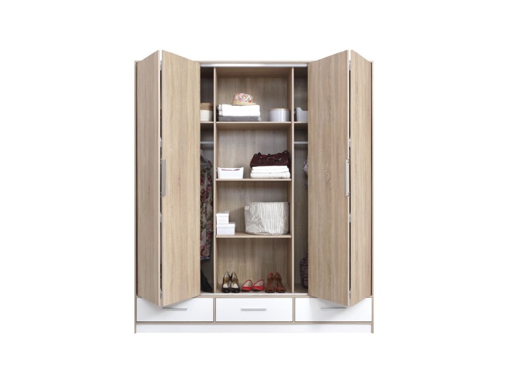 Moderní šatní skříň Sansa, která se hodí absolutně kamkoliv. Kvalitní zpracování a perfektní design. Praktičnost si získala svými skládacími dveřmi, které při otevření zobrazí celý úložný prostor skříně. Ve spodní části skříně naleznete tři zásuvky na uložení spodního prádla. Dominantou skříně je výška 230 cm, tím pádem vám vznikne ještě větší úložný prostor a nemusíte řešit nadstavec.