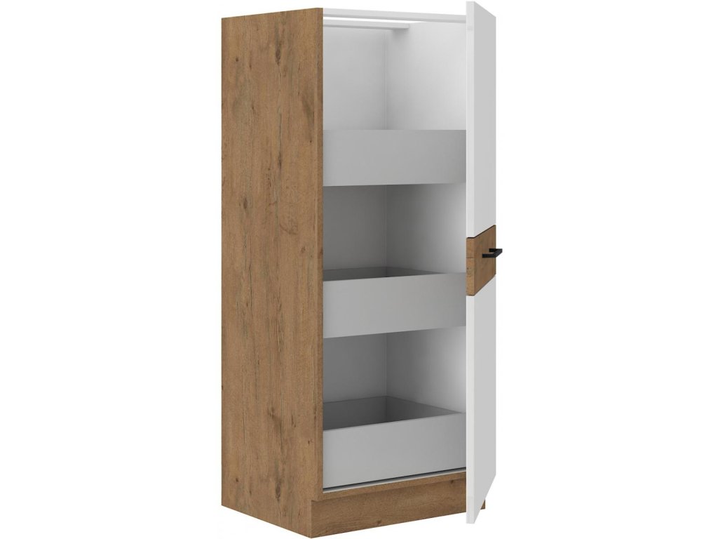 Kuchyňská potravinová skříň 50DK-145-1F (3S) je vyrobena z lamina v dekoru dub lancelot v kombinaci s bílým vysokým leskem. Uvnitř skříně se nachází 3 samostatné šuplíky. Nabízí dostatek úložného prostoru nejen na potraviny. Prohlédněte si širokou nabídku skříněk a vytvořte si kuchyň dle vlastních představ. Může být rohová, rovná, krátká i dlouhá. Fantazii se meze nekladou. V doplňkových fotografiích najdete pro inspiraci fotky kuchyní, které jsou z těchto skříněk sestaveny. Skříňka je dodávaná v demontu. Součástí je montážní plánek včetně všech potřebných spojovacích materiálů.