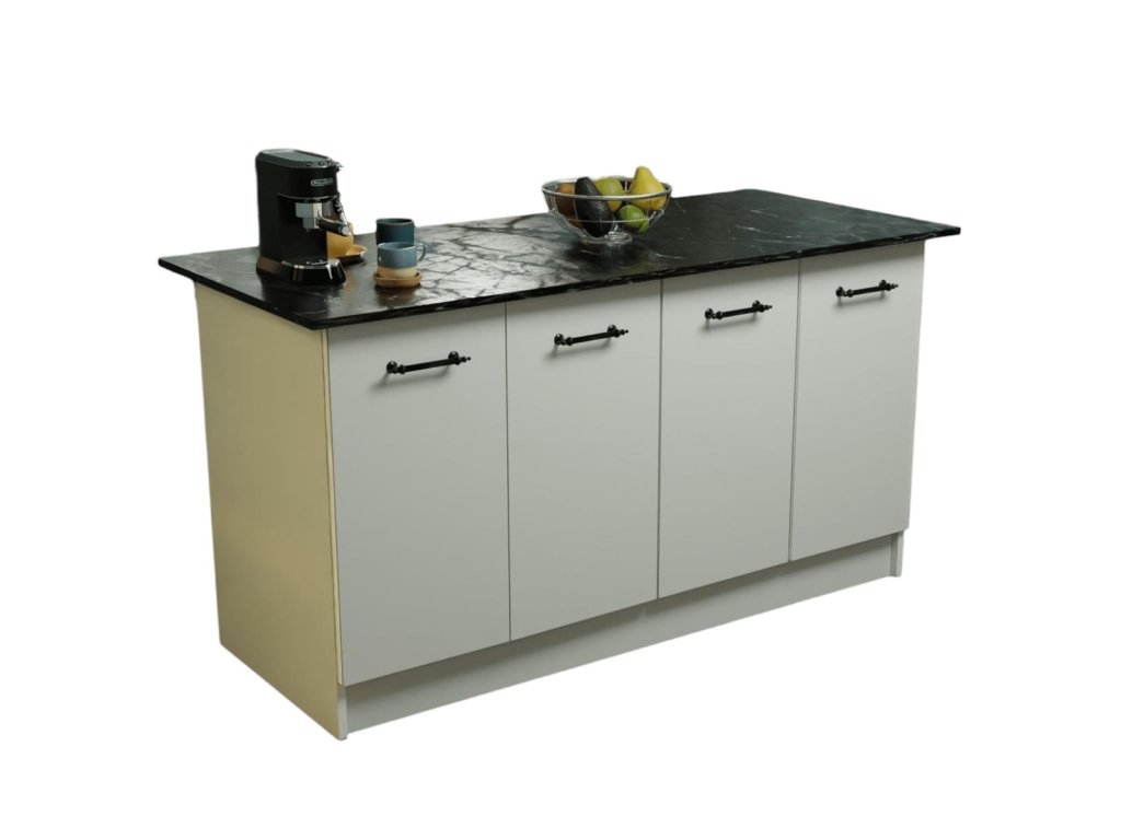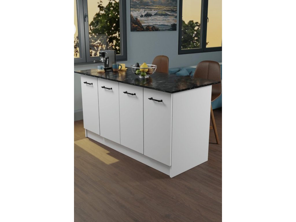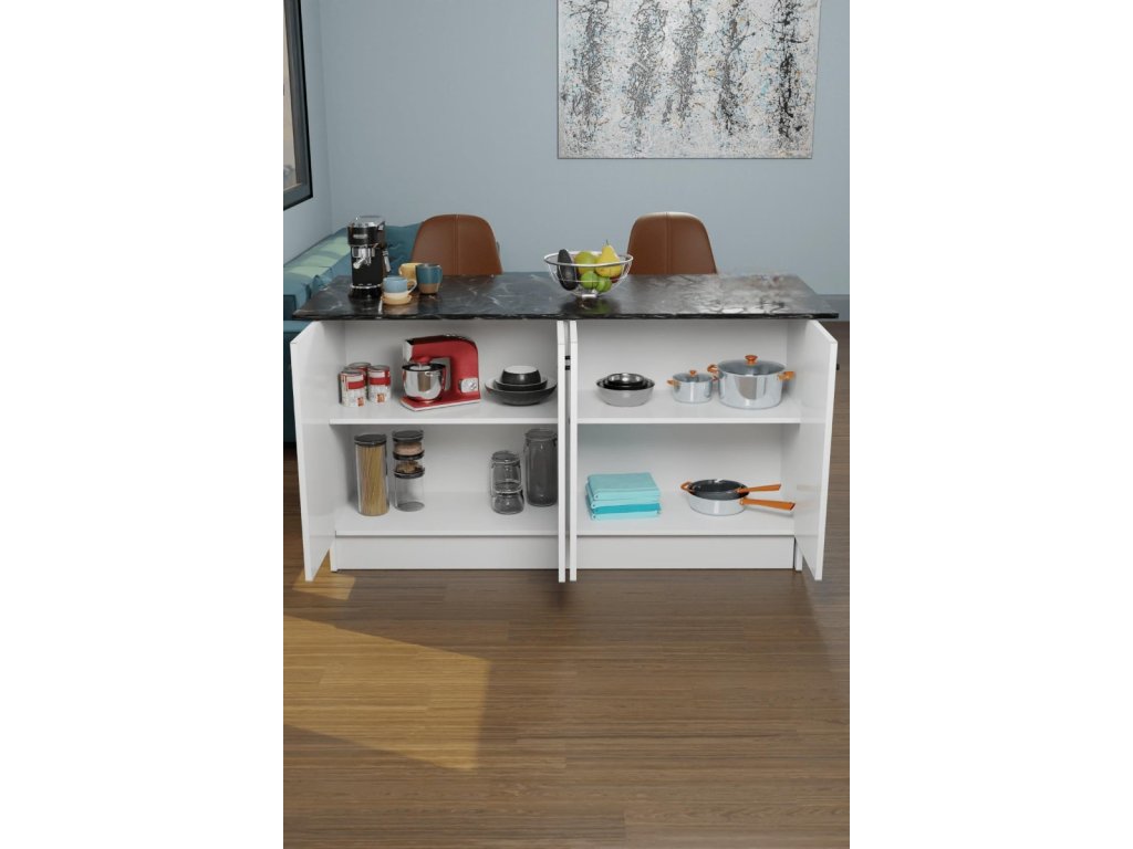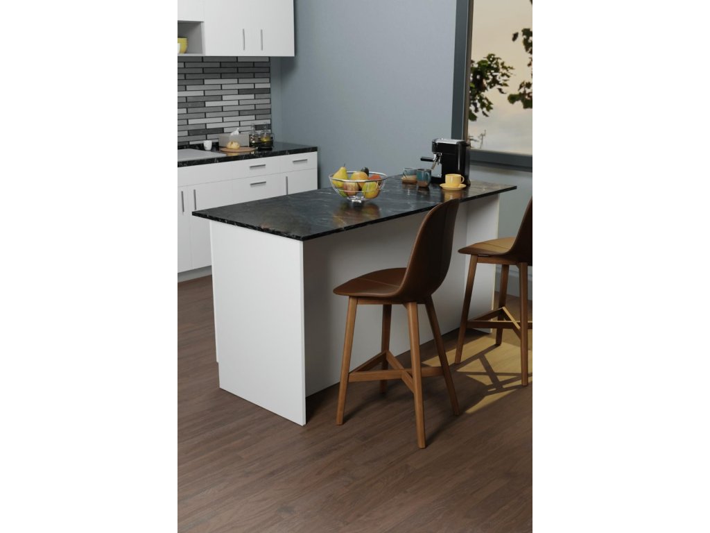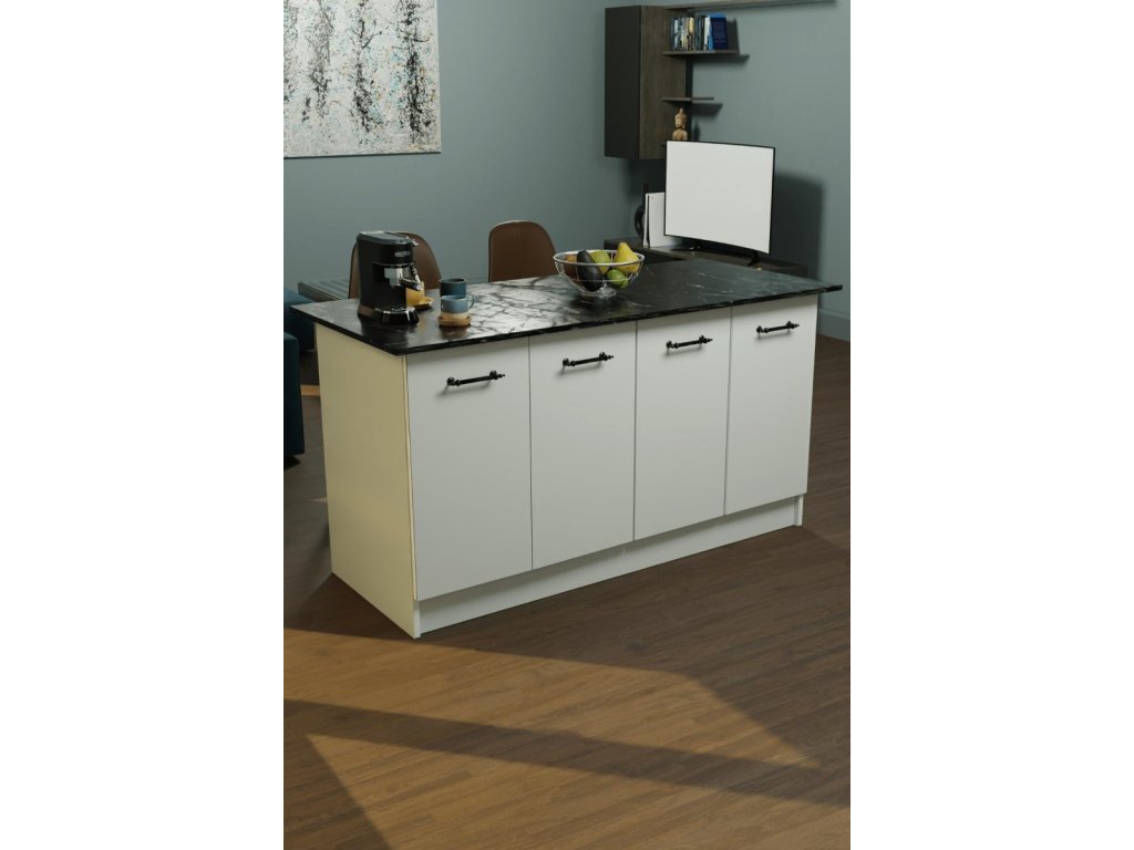 Kuchyňský ostrůvek v bílé barvě a mramoru Výška: 90 cm Šířka: 160 cm Hloubka: 75 cm Ostrůvek disponuje 4 dvířky, za kterými se nachází 2 x 1 prostorná police. Vyroben z kvalitní dřevotřísky potažené melaminem. Dodáváme v demontovaném stavu.Doplňkové parametry