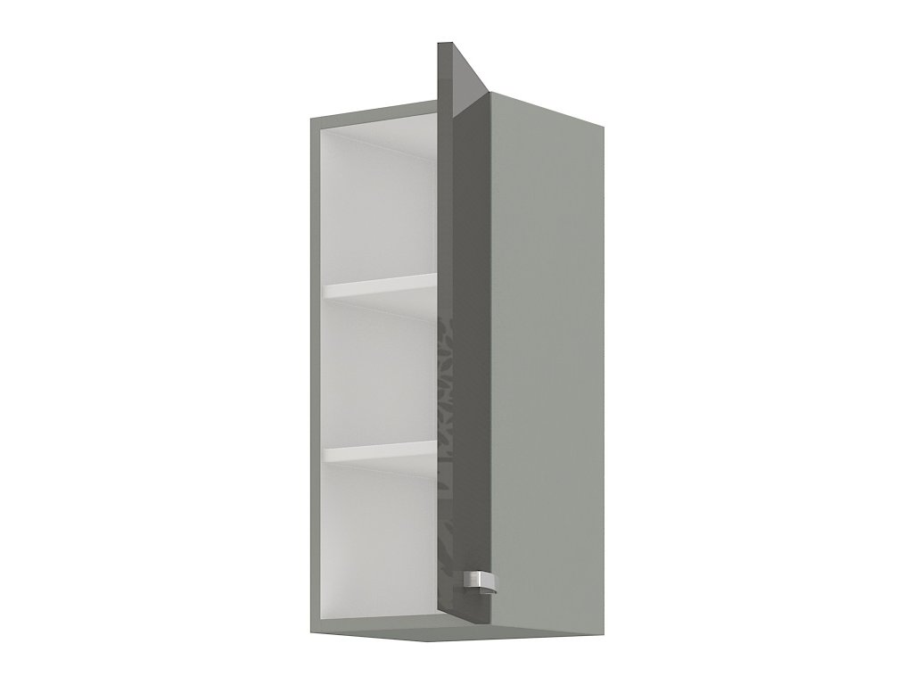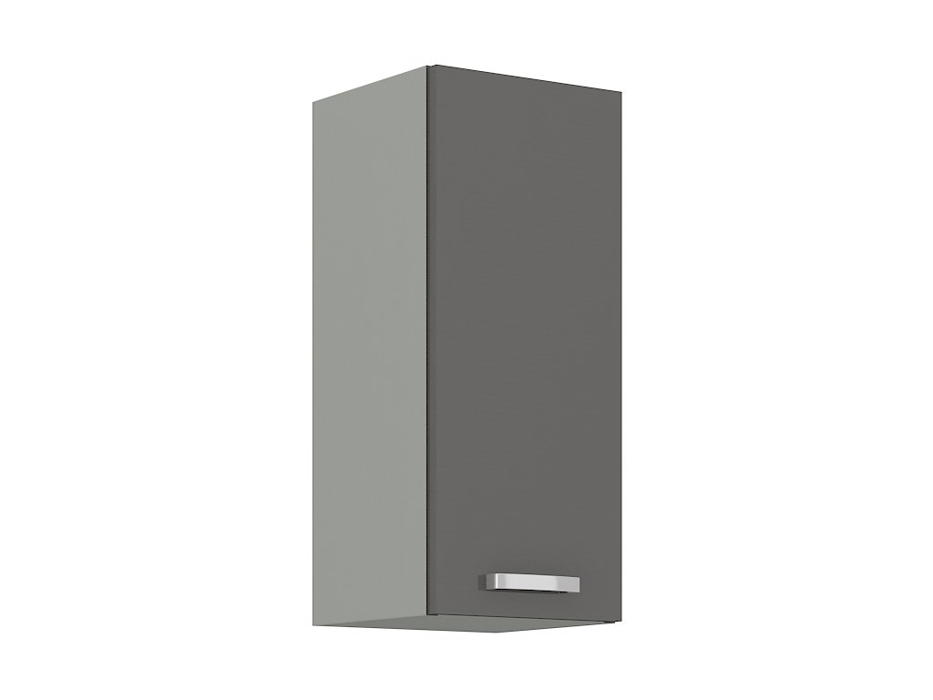 Horní skříňka jednodveřová GREY vyrobená z kvalitního lamina a MDF. Korpus je v barvě šedá a dvířka v barvě grey šedá v lesku. Rozměry skříňky - šířka 30 cm, výška 71,5 cm, hloubka 31 cm. Úchyty jsou z kovu. Dvířka mají pravé otvírání. V naší nabídce naleznete další výběr skříněk k sestavení celé kuchyně.Doplňkové parametry